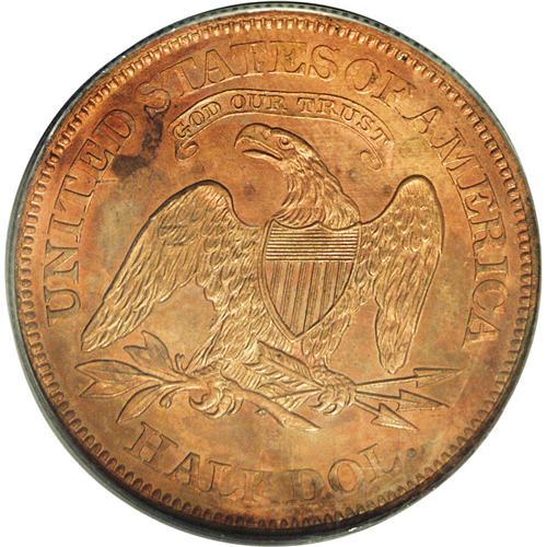 <B>1863 50C Half Dollar, Judd-339, Pollock-411, R.6, PR64 Red and Brown PCGS.</B></I> The obverse is the regular issue design for the 1863 Seated Liberty half dollar. The reverse is similar to the regular issue design with the motto GOD OUR TRUST set on a ribbon in the field above the eagle. Struck in copper with a reeded edge. Another precursor pattern that anticipated the addition of the motto on half dollars in 1866. Sharply struck throughout, the original orange-red surfaces have taken on a slight overlay of lilac in the fields of the obverse. A couple of light spots on the obverse keep this piece from a full Gem designation.<BR><I>From The Jones Beach Collection.</B></I><BR><BR><b>Shipping:</b> Coin/Currency (<a target="_blank" href="http://www.heritageauctions.com/common/shipping.php">view shipping information</a>)