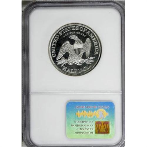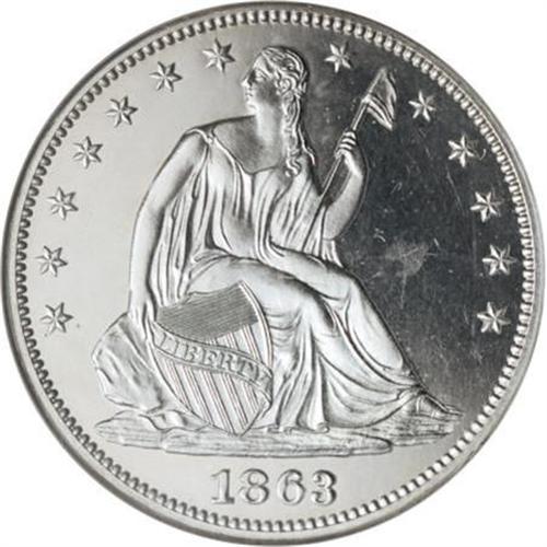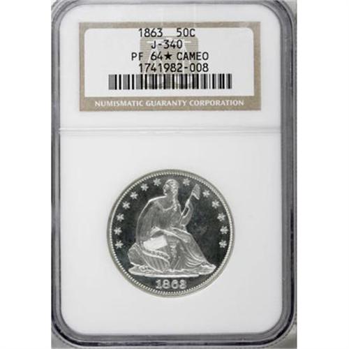 <B>1863 50C Half Dollar, Judd-340, Pollock-412, Low R.6, PR64 </B></I><img src="/images/star.gif" width="10" height="10" alt="" border="0"><B> NGC.</B></I> Similar to the regular issue Seated half dollar of 1863, but the unadorned motto GOD OUR TRUST is present above the eagle. Struck in silver with a reeded edge. The design elements are crisply defined, and both sides of the piece are free of toning. Ice-white devices contrast favorably with nicely mirrored fields. Minor obverse hairlines determine the grade. Census: 2 in 64, 2 finer (11/07).<BR><BR><b>Shipping:</b> Coins & Currency (<a target="_blank" href="http://www.heritageauctions.com/common/shipping.php">view shipping information</a>)