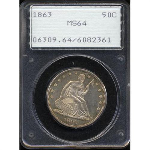 <B>1863 50C MS64 PCGS.</B></I> A lovely semi-prooflike Civil War near-Gem with caramel-gold peripheral toning. Intricately struck aside from the usual minor blending on the eagle's left (facing) ankle. Encapsulated in a first generation holder. A good value given its scarcity in Uncirculated grades. Population: 16 in 64, 12 finer (10/07).<BR><BR><B>Coin Engraver:</B> Christian Gobrecht<BR><BR><b>Shipping:</b> Coins & Currency (<a target="_blank" href="http://www.heritageauctions.com/common/shipping.php">view shipping information</a>)