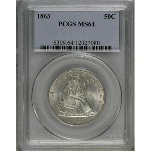 <B>1863 50C MS64 PCGS.</B></I> A surprising and undeniably appealing example of this Civil War-era minor silver issue, boldly struck with faintly toned silver-gray surfaces. Only a few stray flaws in the fields preclude a finer designation. Population: 17 in 64, 12 finer (3/08).<BR><BR><B>Coin Engraver:</B> Christian Gobrecht<BR><BR><b>Shipping:</b> Coins & Currency (<a target="_blank" href="http://www.heritageauctions.com/common/shipping.php">view shipping information</a>)