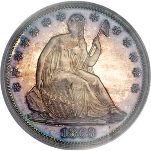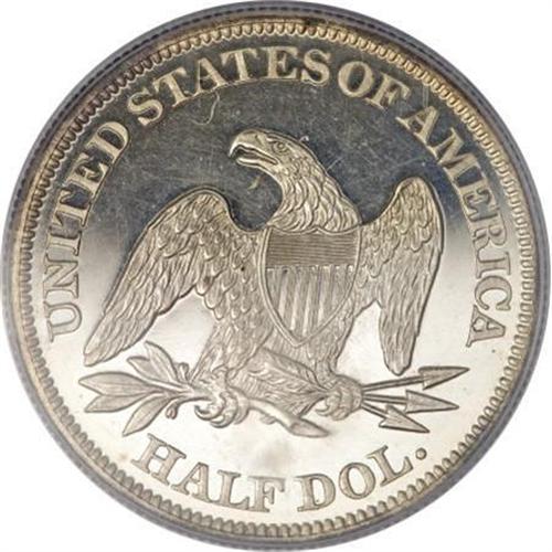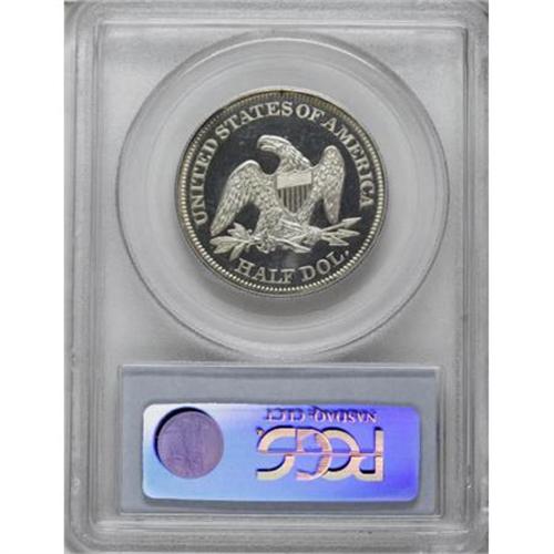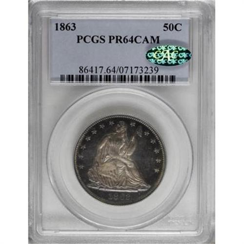 <B>1863 50C PR64 Cameo PCGS. CAC.</B></I> The reverse is brilliant, while the obverse offers a light coating of mauve and steel-blue. The cameo contrast is evident, especially on the black-on-white reverse. This specimen can be identified by a slender lintmark beneath the TA in STATES. One of only 460 proofs issued in this Civil War year. Population: 5 in 64 Cameo, 3 finer (11/07).<BR><I>From The Kallenberg #1 PCGS Registry Set Of Proof Half Dollars.</B></I><BR><BR><b>Shipping:</b> Coins & Currency (<a target="_blank" href="http://www.heritageauctions.com/common/shipping.php">view shipping information</a>)