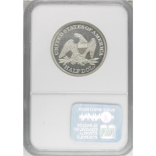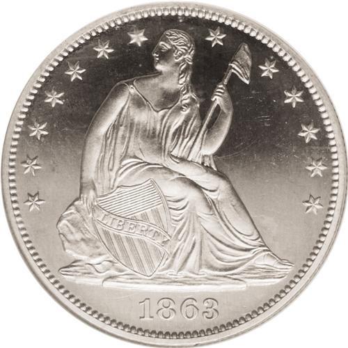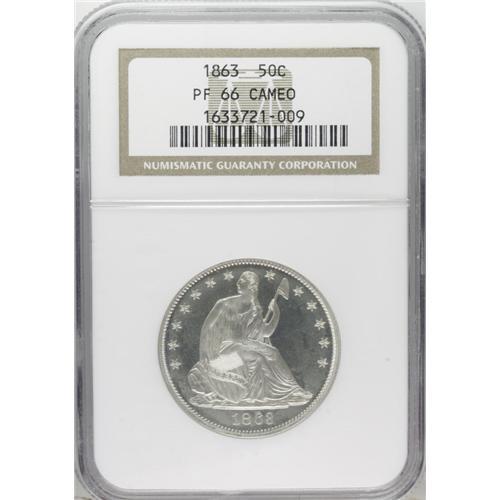 <B>1863 50C PR66 Cameo NGC.</B></I> While designated as a Cameo proof example, this lovely Premium Gem is a borderline Ultra Cameo specimen. The intensity of mint frost on the devices on each side easily qualifies for such honors, but the light champagne haze on each side slightly diminishes the actual contrast that appears between the devices and the fields. Silver coins from the Civil War era are difficult to locate, although half dollars are more available than most other denominations as mintages were generally quite a bit higher. However, high quality business strikes and proofs are still elusive. This is a delightful example that will please the connoisseur. Census: 2 in 66, 2 finer (12/06).<BR><BR><b>Shipping:</b> Coin/Currency (<a target="_blank" href="http://www.heritageauctions.com/common/shipping.php">view shipping information</a>)