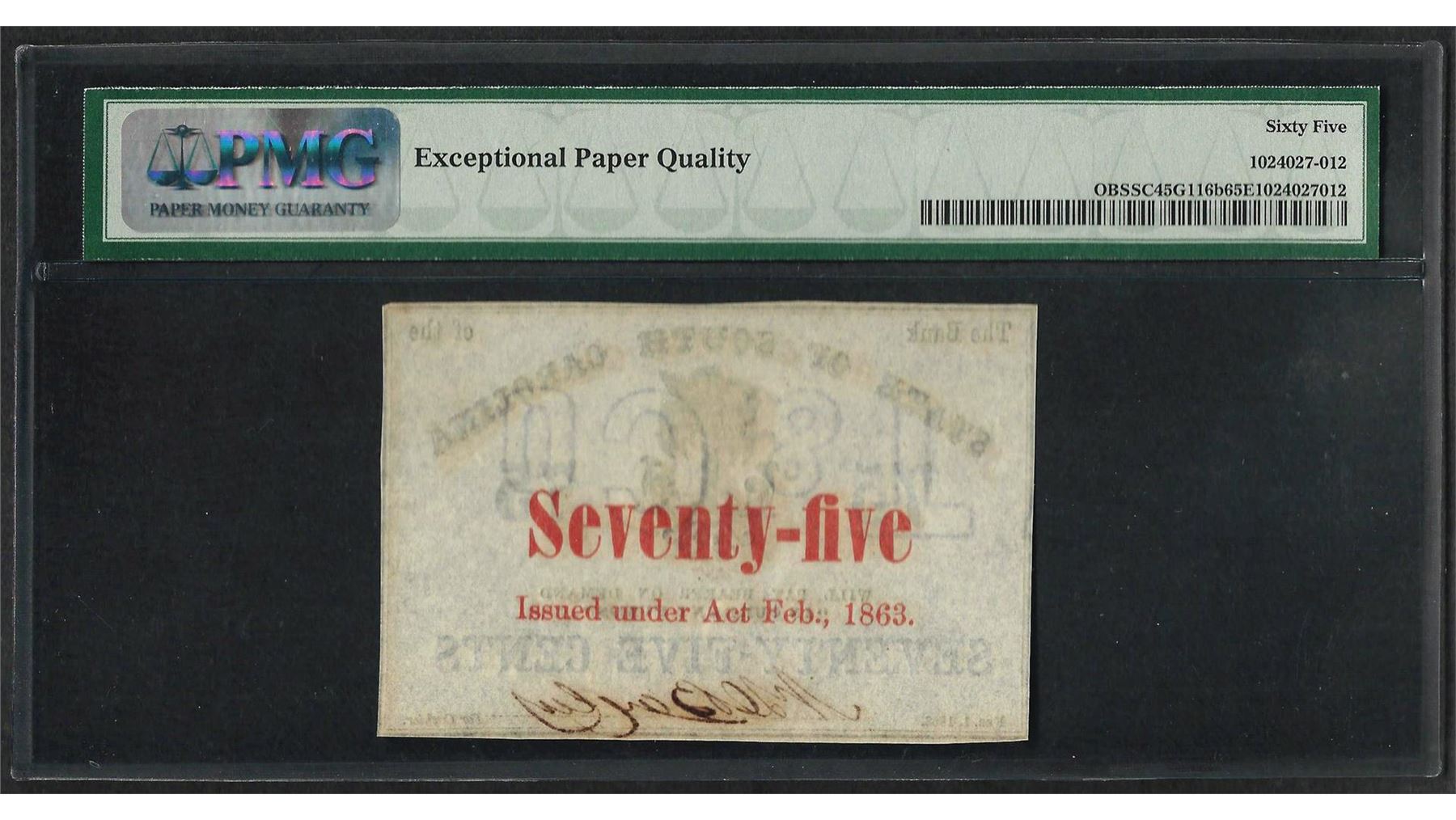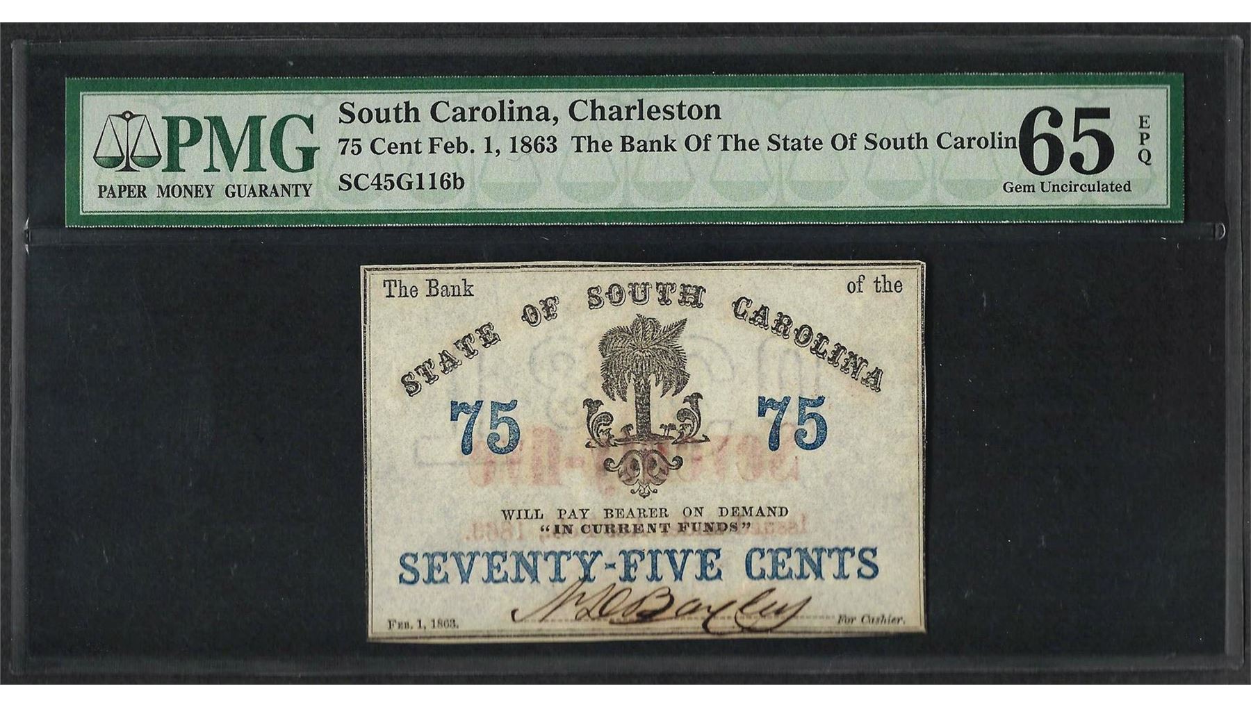 1863 75 Cent Bank of State of South Carolina Obsolete Note PMG Gem Uncirculated