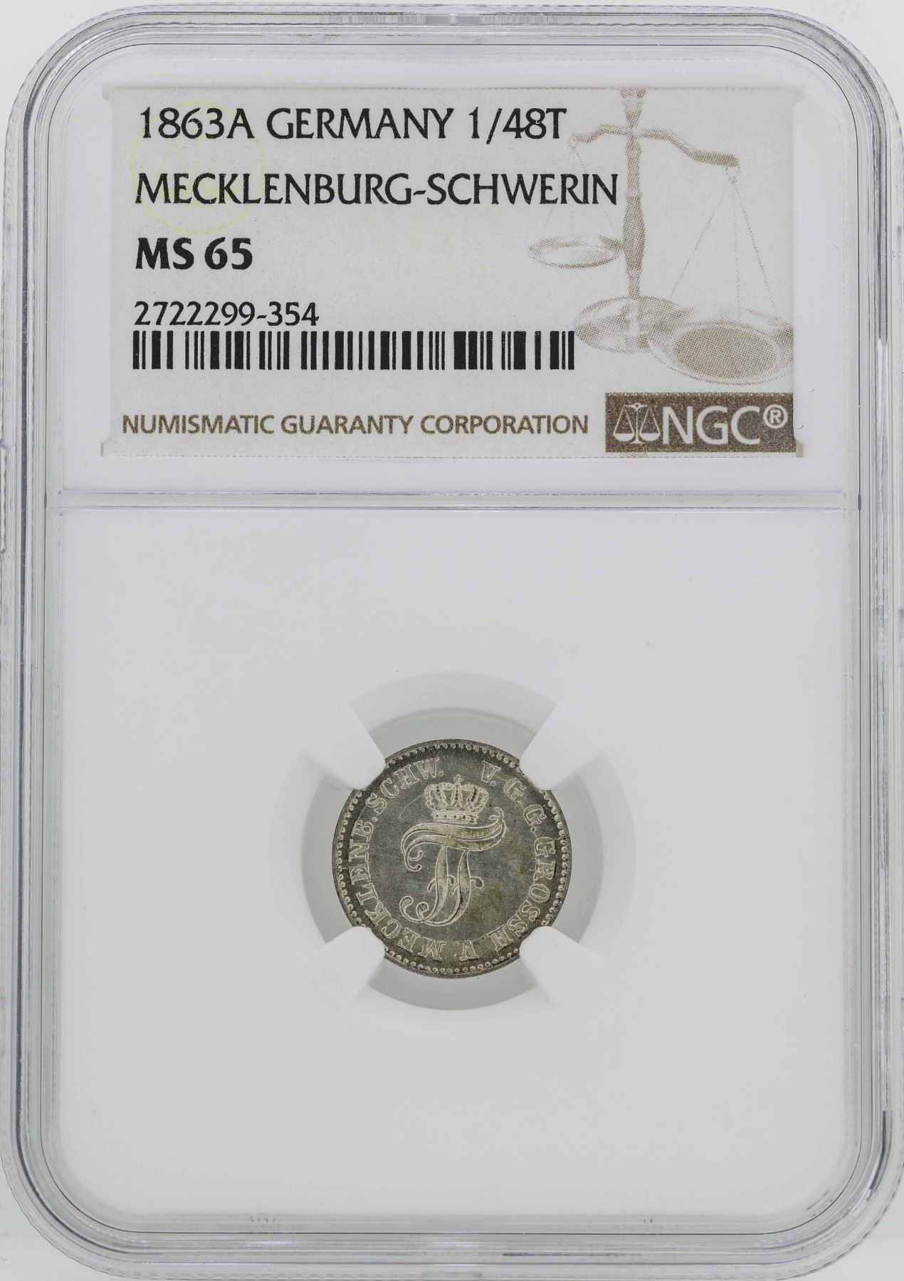 One 1863-A Germany Friedrich Franz II 1/48 Thaler Coin NGC MS65.