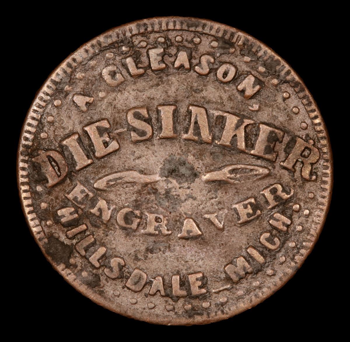 1863 A.Gleason Die Sinker Civil War Token 1c Grades vf++. We've Including with the pics of the lot a section of the Hilslsdale standard from November 14th of 1865 and a close up of Mr.Gleason's Ad A Corey's Pick