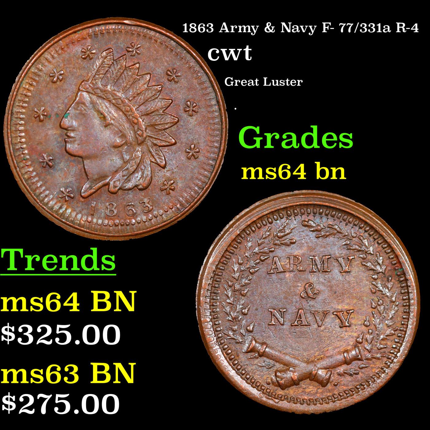 1863 Army & Navy F- 77/331a R-4 Civil War Token 1c Grades Choice Unc BN.