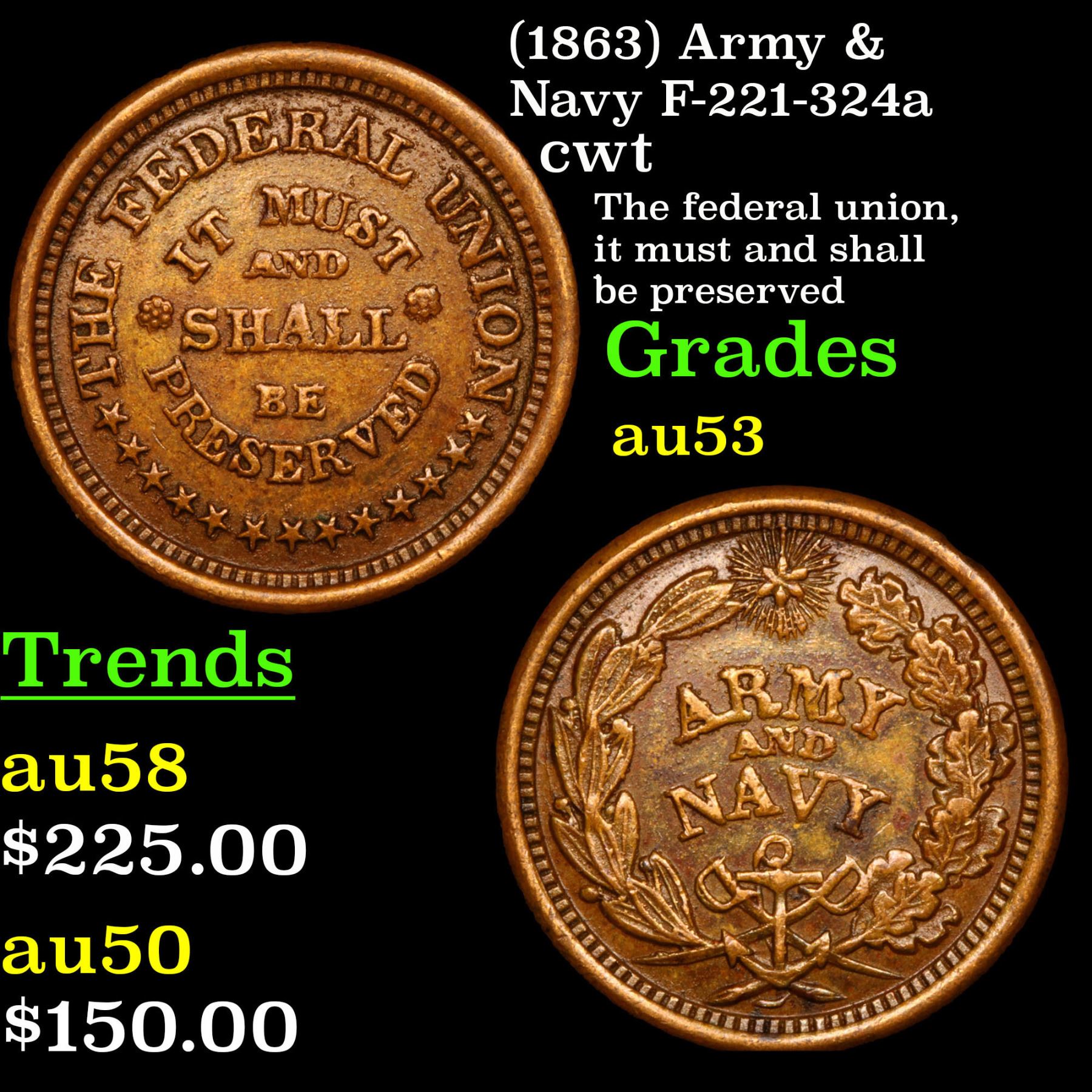 (1863) Army & Navy F-221-324a Civil War Token 1c Grades Select AU.