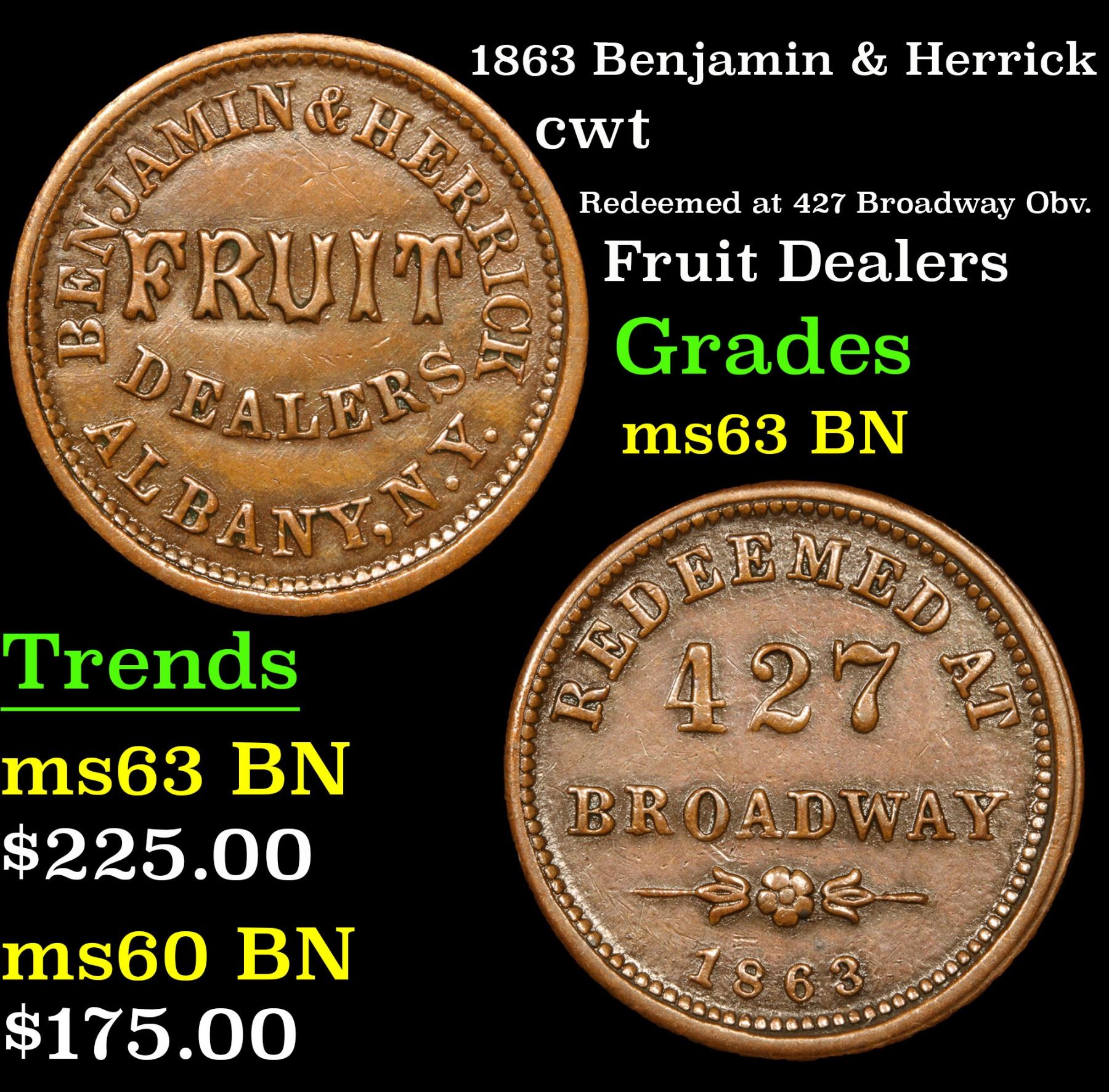 1863 Benjamin & Herrick Civil War Token 1c Grades Select Unc BN. Redeemed at 427 Broadway Obv.; Fruit Dealers