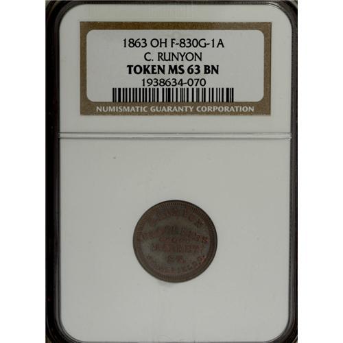 <B>1863 C. Runyon, Grocer, Springfield, OH, Fuld-OH-830G-1a, R.8, MS63 Brown NGC.</B></I> A scarce Civil War token, with semiglossy fields accented by deep orange and original mint red among the lettering and other devices. Valued in Kanzinger at $200 in MS60.<BR><BR><b>Shipping:</b> Coin/Currency (<a target="_blank" href="http://www.heritageauctions.com/common/shipping.php">view shipping information</a>)