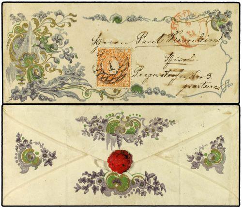 (1863 CA.) ESPECTACULAR sobre ornamentado en anverso y reverso circulado con sello 1/2 ngr. naranja. RARO.