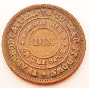 One side is dated 1863 with a flag and is marked THE FLAG OF OUR NATION. The other side is marked IF ANYBODY ATTEMPTS TO TEAR IT DOWN SHOOT HIM ON THE SPOT - DIX