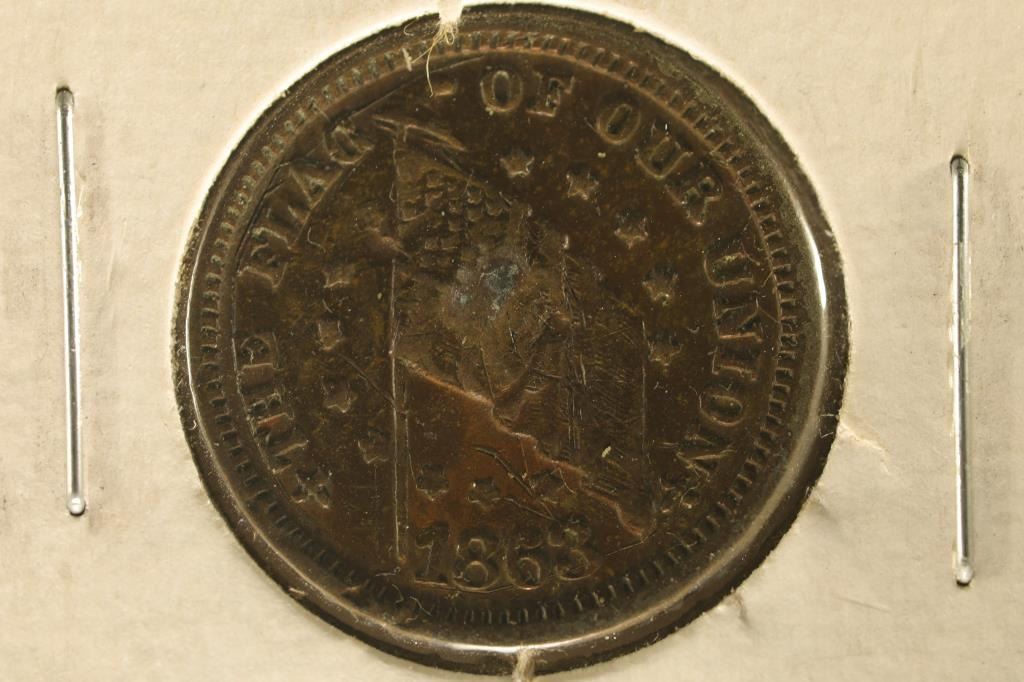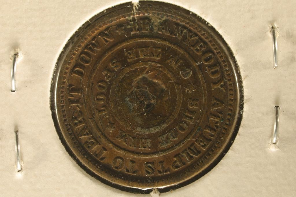 ON THE OBVERSE AND "IF ANYBODY ATTEMPS TO TEAR IT DOWN SHOOT EM ON THE SPOT" ON THE REVERSE, POSSIBLE COUNTER STAMP