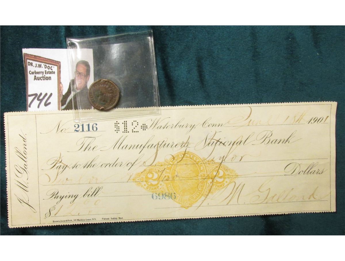 1863 Civil War Indian Head Cent. Good. Damaged; & 1901 Check from Waterbury, Conn. On "The Manufactu