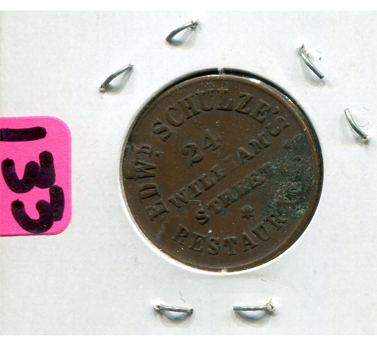 Rarity: R-1, Edwd Schulze's Restaurant - New York, Beautiful Stag Head on obverse