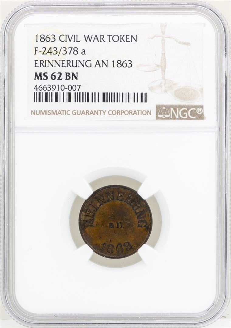One 1863 Civil War Token Erinnerung AN NGC MS62BN. NGC Certified.