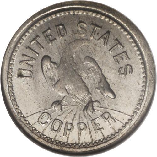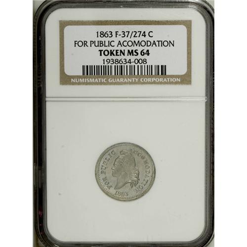 <B>1863 Civil War Token, Fuld 37/274C, R.8, MS64 NGC.</B></I> White metal. All off-metal Civil War tokens are scarce to rare, and this one is no exception. Listed as an R.8 in the <I>Civil War Token Collectors Guide</B></I> by Bryon Kanzinger. The token exhibits a steel-gray finish with typical flat areas on both sides due to overused dies.<BR><BR><b>Shipping:</b> Coin/Currency (<a target="_blank" href="http://www.heritageauctions.com/common/shipping.php">view shipping information</a>)