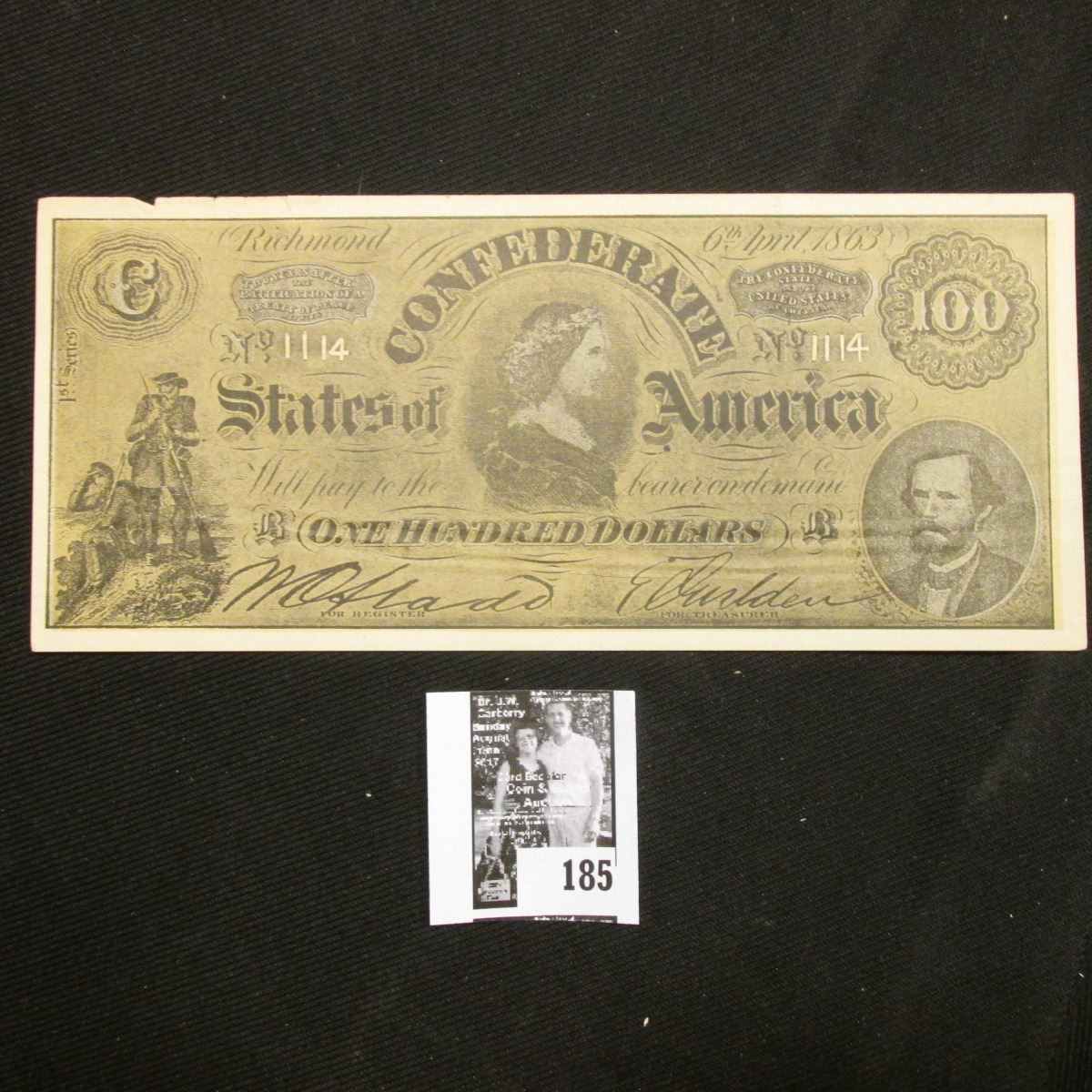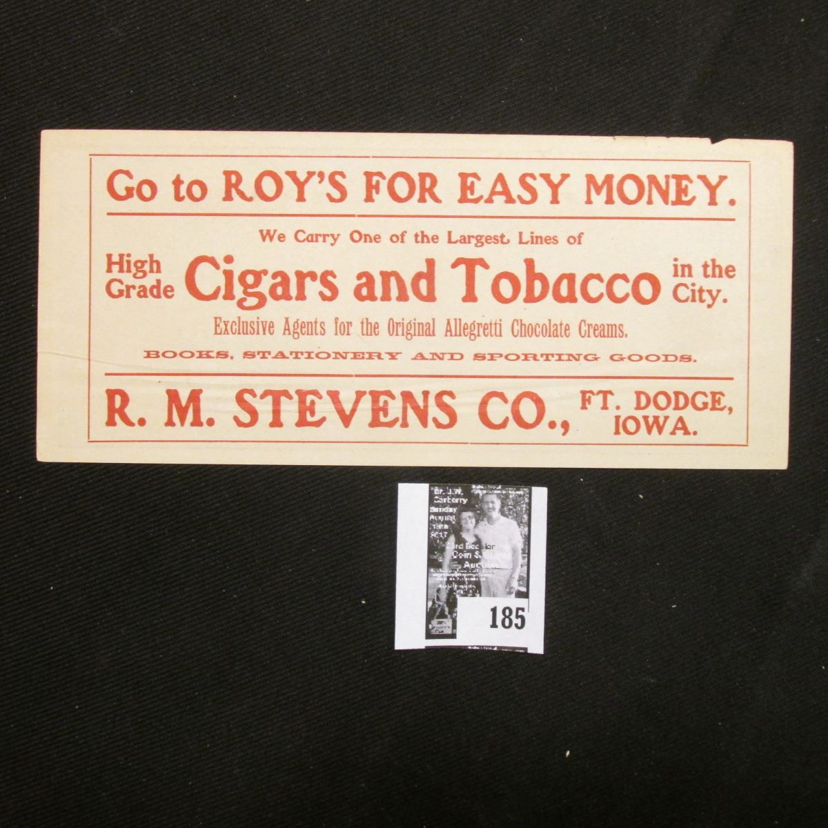 1863 Confederate States of America Facsimile note with old Advertising "Go to ROY'S FOR EASY MONEY. We Carry One of the Largest Lines of High Grade Cigars and Tobacco in the City…R.M.Stevens Co., Ft. Dodge, Iowa."