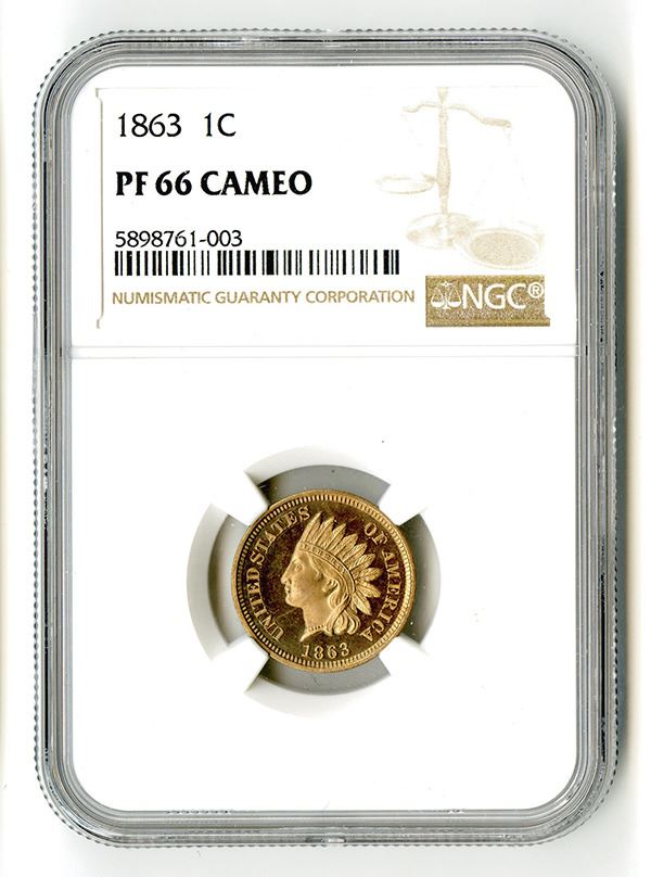 U.S., 1 Cent Indian Proof. 1863. Mintage: 460. NGC Universal ID: 229D. Copper Nickel. Attractive Cameo proof with a relatively small population of 460. Frosty surfaces and smooth reflective finish enhance this lovely coin.