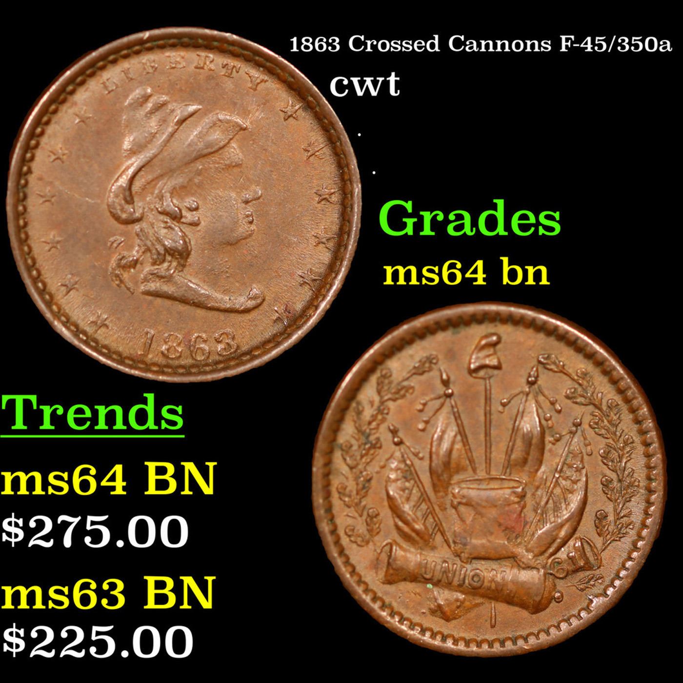 1863 Crossed Cannons F-45/350a Civil War Token 1c Grades Choice Unc BN.