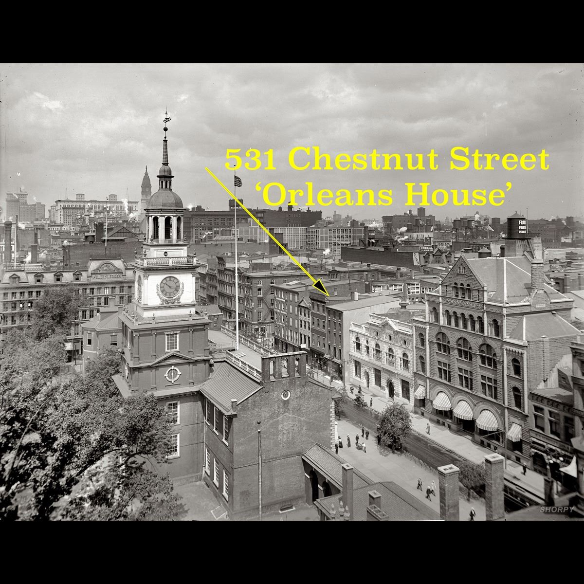 When I came on this Civil War token the first time and asked the audience if anyone knew what an “Orleans House” was, I was answered that it was a hotel. To my embarrassment, I had thought that an “Orleans House” was a “House of Ill Repute”, lol, Upon coming upon this Token for a second time, I decided I owed you all some effort, so I researched the address. It just so happens that 531 Chestnut Street is a very significant address for All Americans as it is Directly across the street from the Birthplace of our Nation. It is precisely opposite the entrance to Independence Hall. Today, there is nothing present at that spot as it is a National Park and only grass occupies its location. Matt and I spent a few minutes and traced back through photographs the history of 531 Chestnut. We have included 5 photos of this historic location. From the vacant Lot just before it was turned into the park which clearly shows 533’s facade (1949), to 1953 right after it was leveled, to 1957 after the park was first modest sized formed, to how the full independence park appears today. But the most interesting is the last photo. This is a photo unearthed by Matt, it is how the site appeared in 1910. I believe the building the arrow points to is the original home of the Orleans House as it stood in 1863. I think you can match up exactly the facade of 533 to verify this location. WOW! I hope you enjoy these photos as much as I do,