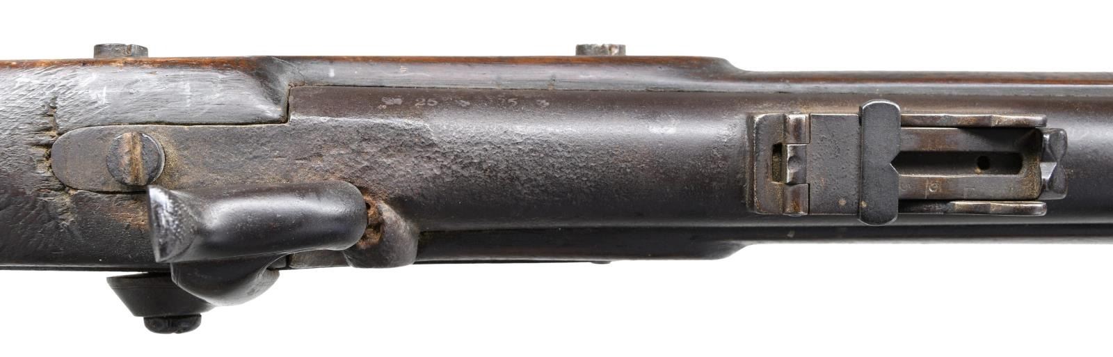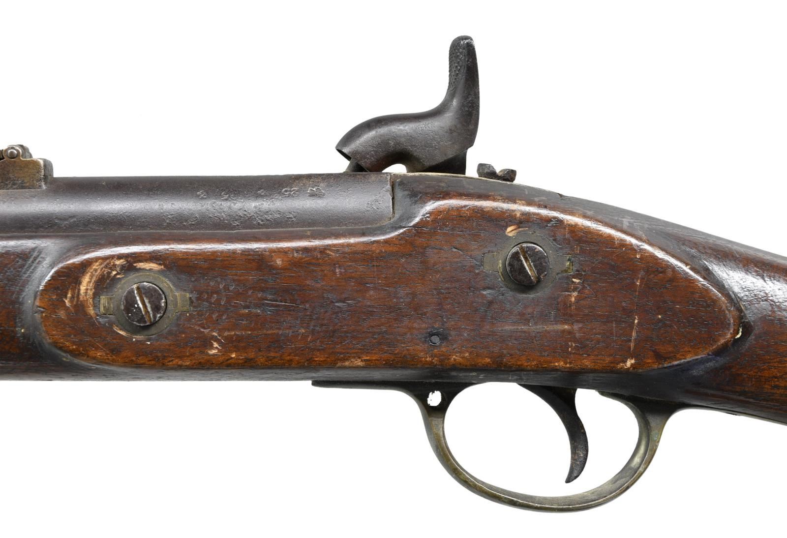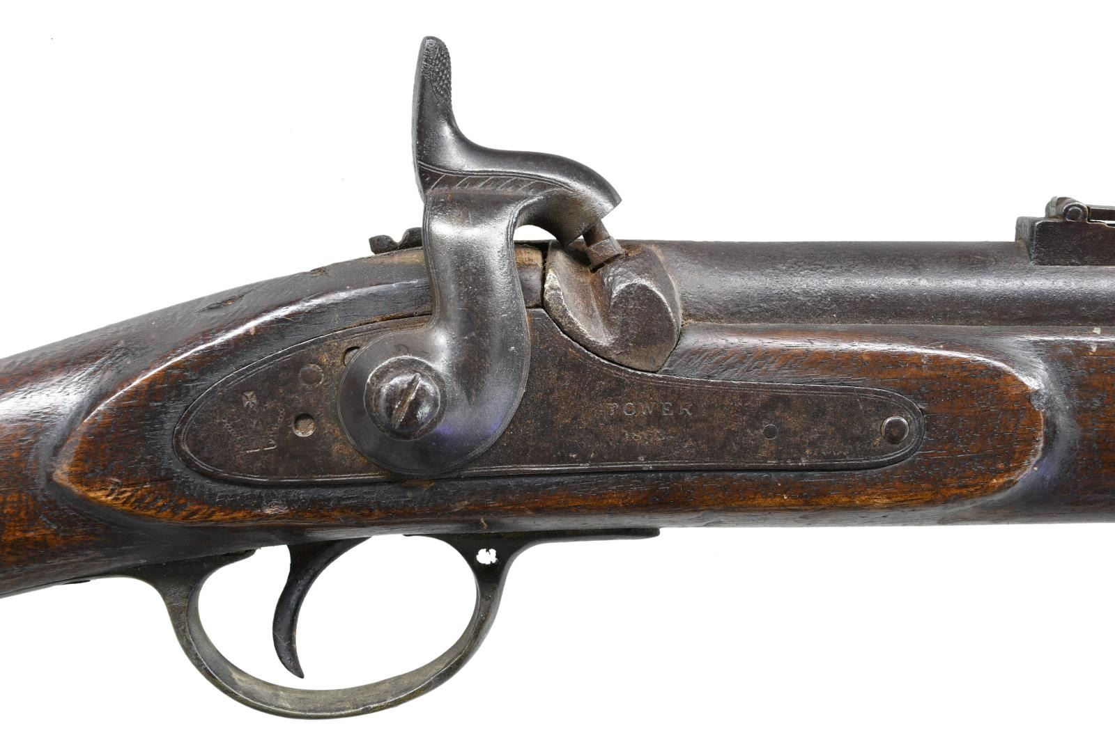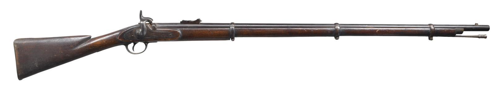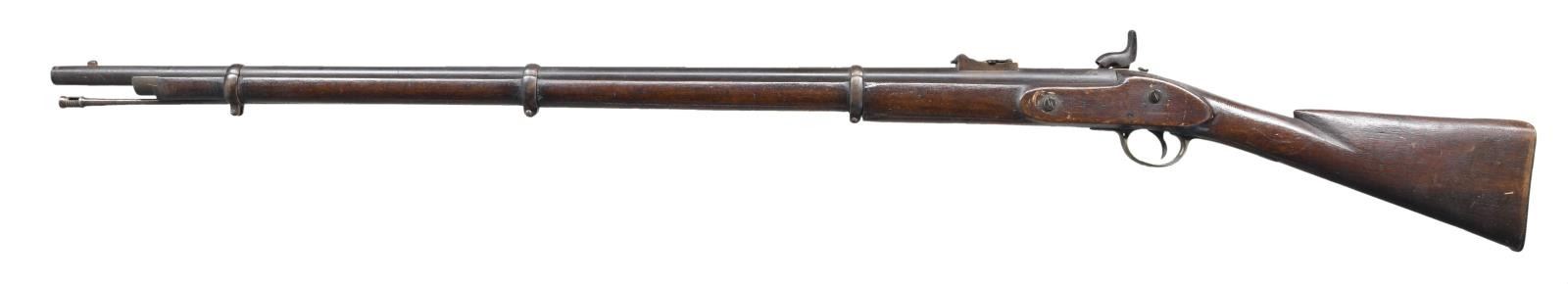 Cal. 577 NSN. Standard configuration of the South's most popular import, 39” barrel, brass trigger guard, butt plate, nosecap, & lock screw escutcheons, three iron clamping bands. Lock marked with crown & “1863 / TOWER”. CONDITION: Good to very good overall. Complete and original accept missing sling swivels. Mechanics fine, dark pitted rifled bore. (01-22945/JS). ANTIQUE. $800-1,200.