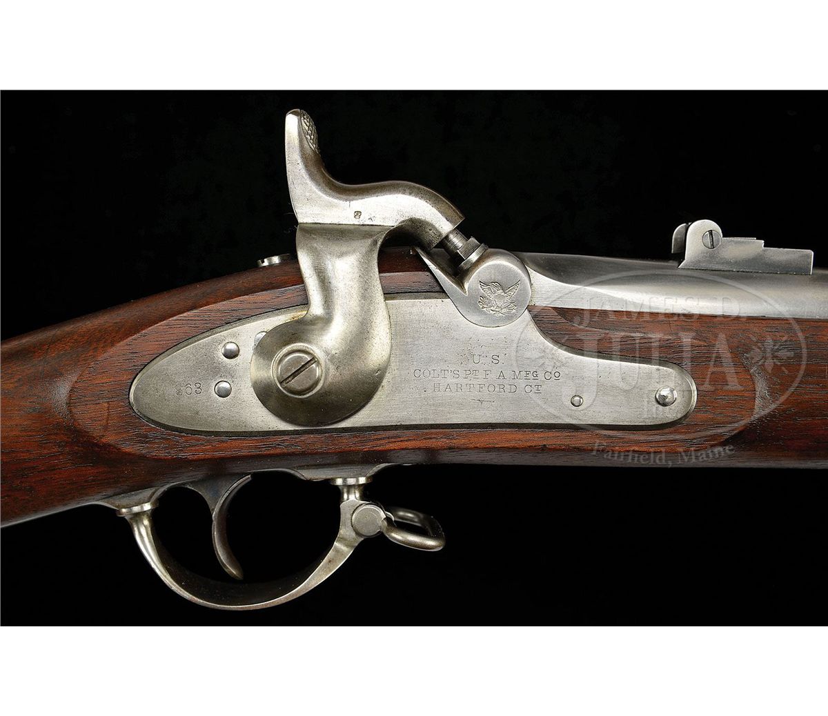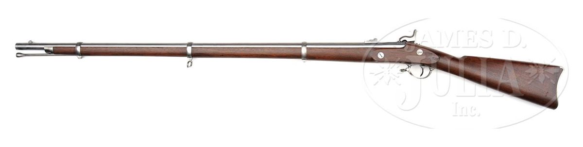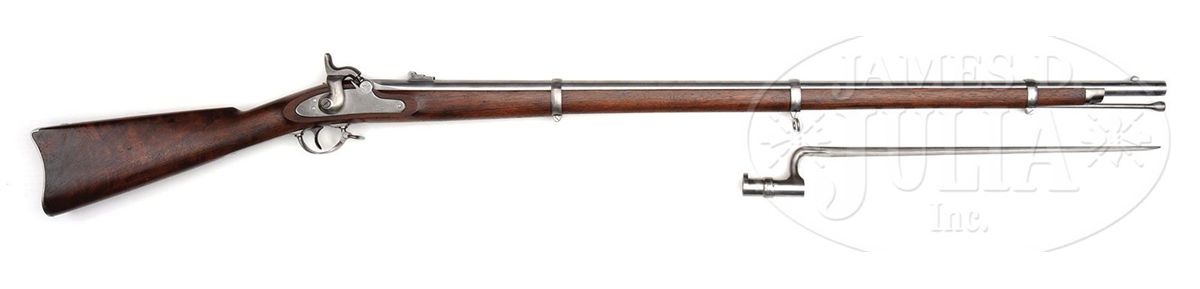 NSN. Cal .58, 40" bbl. This is a very nice example of a Colt Contract Musket utilizing 1863 style clamping bands and being dated 1863 on lock & bbl. This gun is in near new condition with bright metal, crisp marks, crisp bore & rifling and fine inspector cartouches with accompanying bayonet that matches condition and fits gun well. This is a fine example that is 100% orig & complete that would be difficult to upgrade. PROVENANCE: Preston Tucker Collection (Tucker Car Corp.), Marlan Polhemus Collection. CONDITION: Metal overall is gray/white with scattered staining. Markings are crisp and well-defined as are inspector cartouches in stock. Stock is sound & solid with areas of raised grain with scattered storage dings & dents. 4-48835 JS58