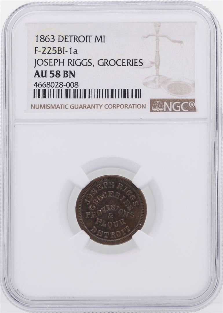 One 1863 Detroit, MI Joseph Riggs Groceries Civil War Token NGC AU58BN. NGC Certified.