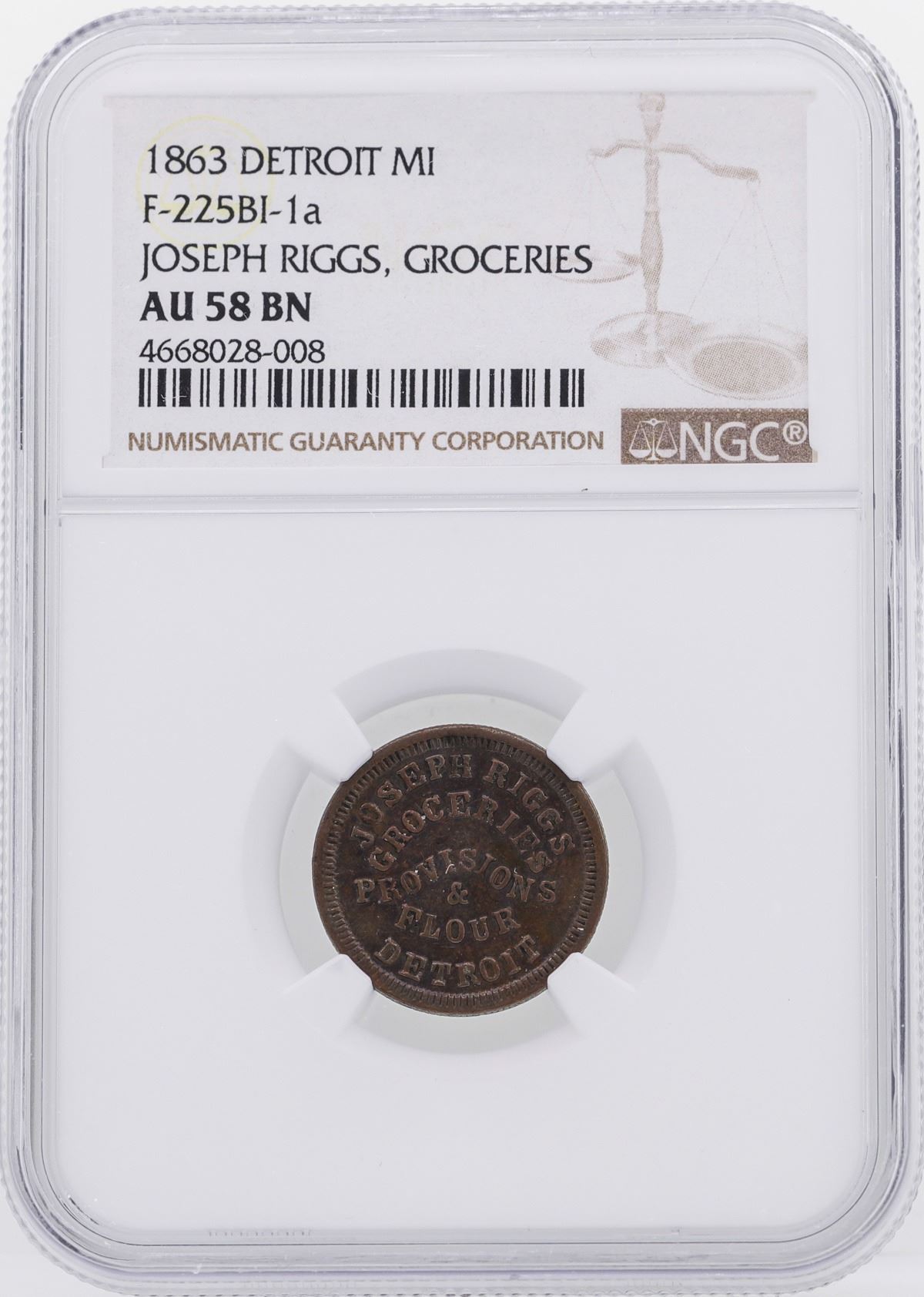 One 1863 Detroit, MI Joseph Riggs Groceries Civil War Token NGC AU58BN.