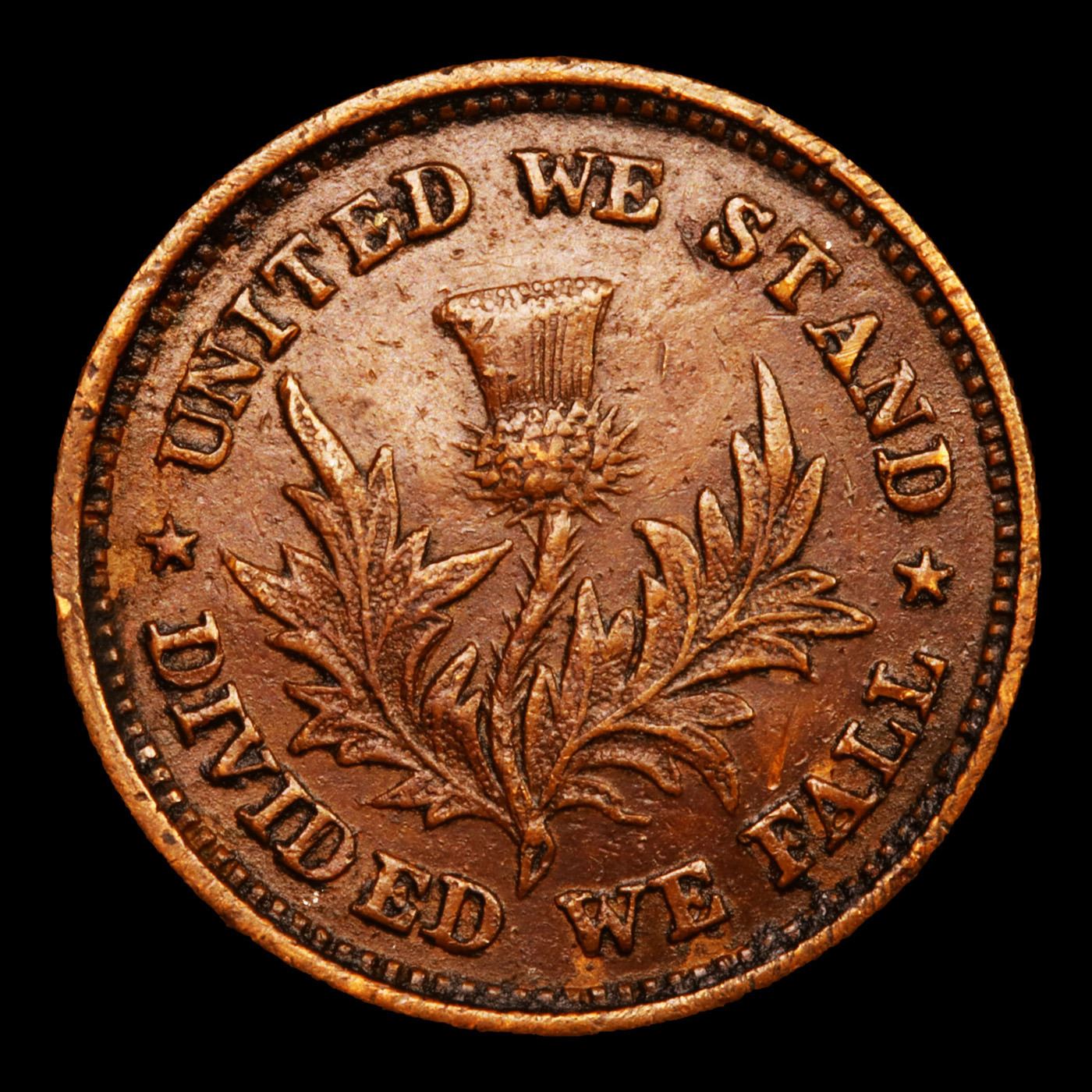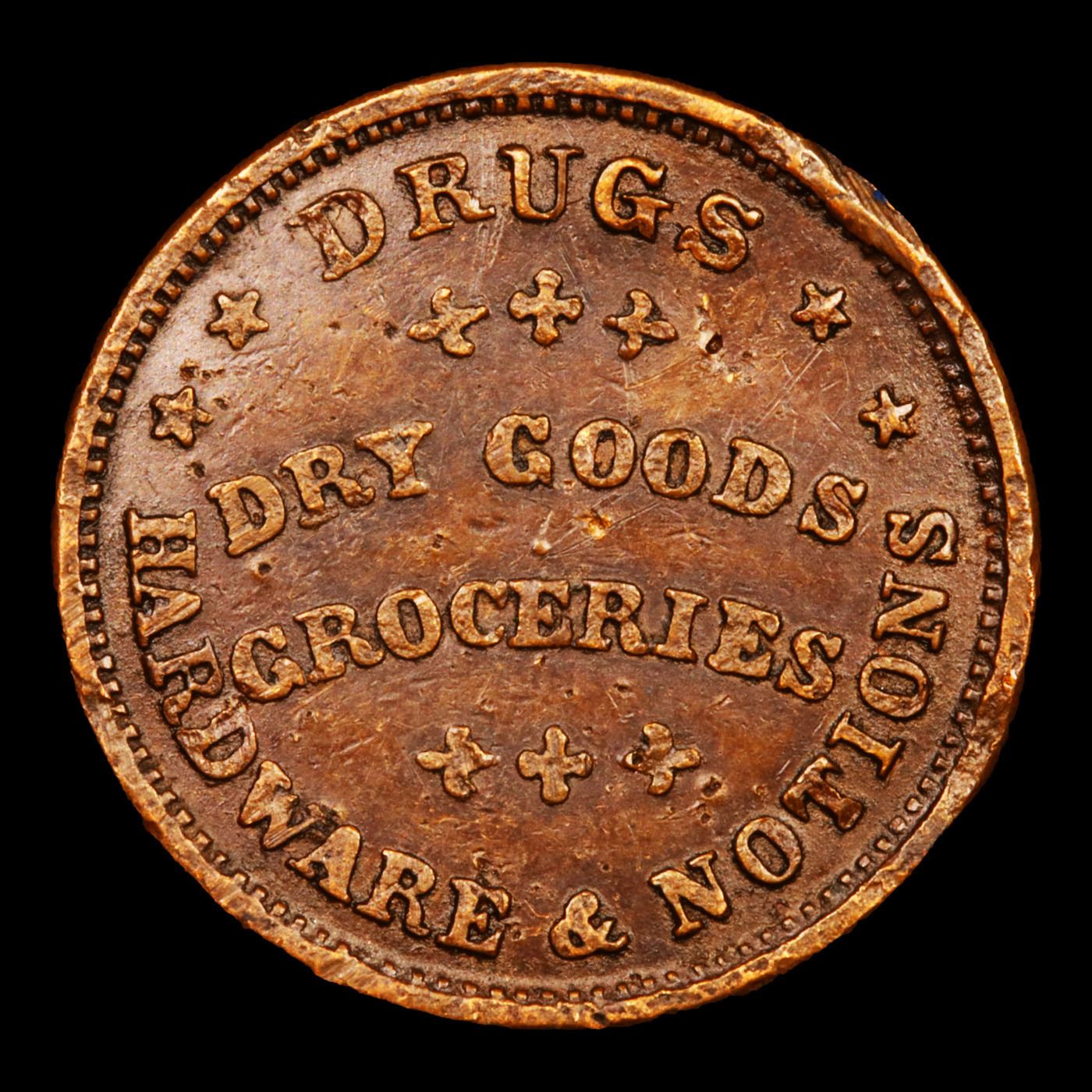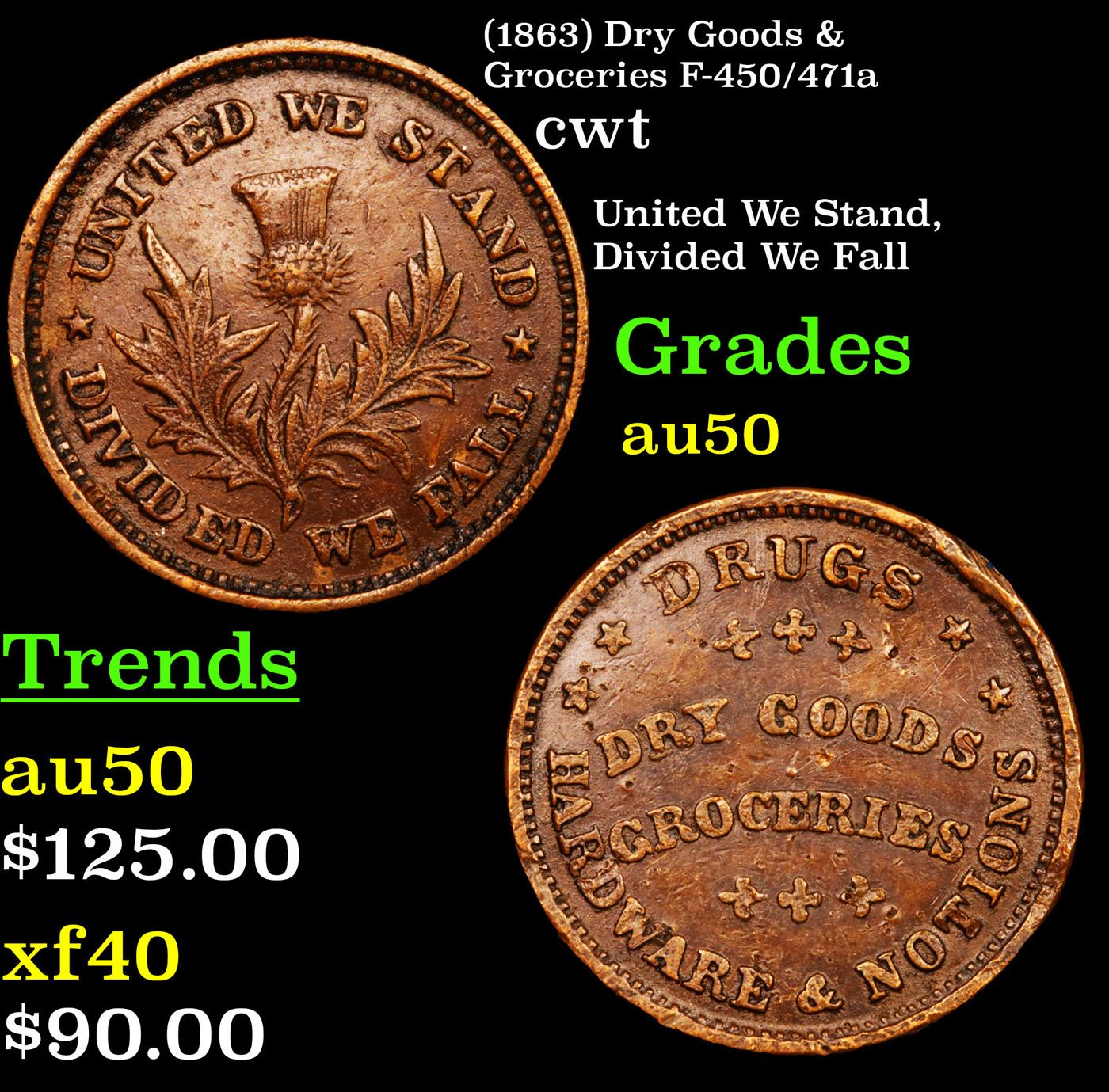 (1863) Dry Goods & Groceries F-450/471a Civil War Token 1c Grades AU, Almost Unc. Obverse: Drugs, Dry Goods, And Groceries Hardware & Notions Reverse: United We Stand, Divided We Fall