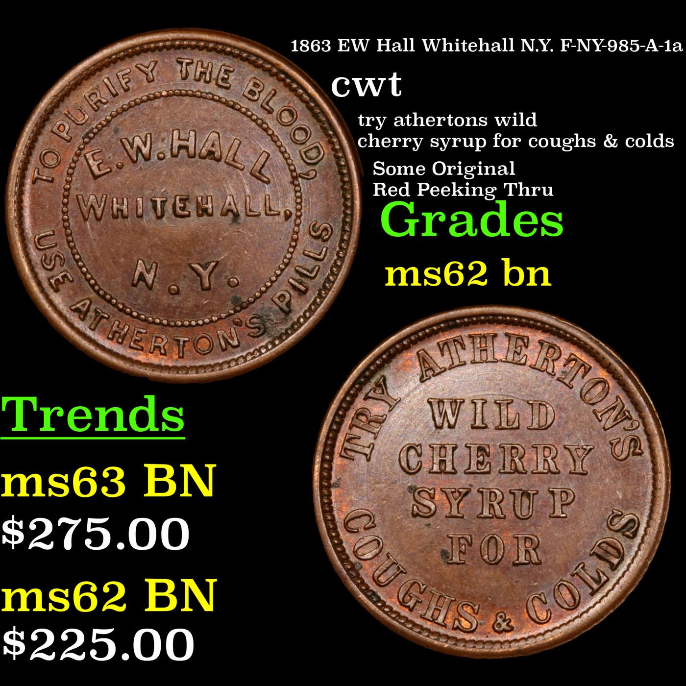 1863 EW Hall Whitehall N.Y. F-NY-985-A-1a Civil War Token 1c Grades Select Unc BN.