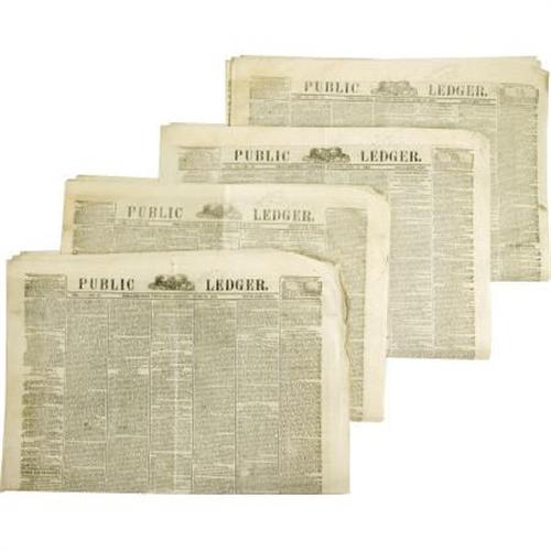 <B>Nine 1863 Editions of the Philadelphia </B></I><B><I>Public Ledger</B></I></B></I> w<B>ith Gettysburg Battle Content.</B></I> Each edition four pages, 17.25” x 24”, includes June 25, 26, 27, and 30, 1863, July 6, 8, and 9, 1863, September 3, 1863 and May 15, 1865 editions, toned buy in remarkably good condition. These papers make a nice bookend to the events leading up to and immediately after the famous battle at Gettysburg fought July 1 through 3, 1863. Leading off on June 30, 1863 is an article entitled “The Invasion of Pennsylvania” which sets the stage for the events to come. The July editions give great accounts of the aftermath of the main battle. An opportunity to read contemporary accounts of the battle just as the citizens of Philadelphia did. <I>From the collection of Henry E. Luhrs.</B></I><BR><BR><b>Shipping:</b> Flat Material, Small (<a target="_blank" href="http://www.heritageauctions.com/common/shipping.php">view shipping information</a>)