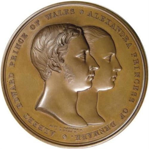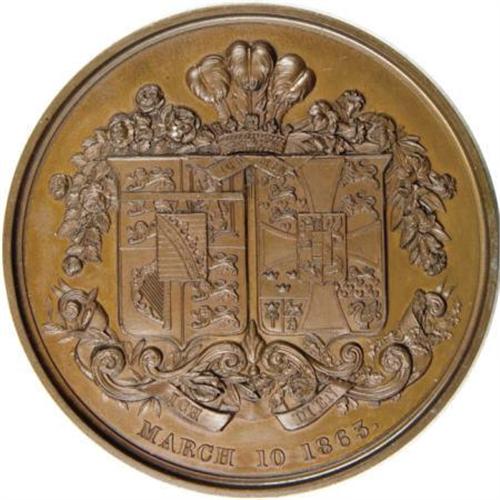 <B>1863 Prince Edward and Princess Alexandra Wedding Medal.</B></I> Bronze, 63.3 mm, 126.4 gm. A hefty bronze medal which commemorates the royal wedding on March 10, 1863 of Albert Edward, Prince of Wales, to Princess Alexandra, the eldest daughter of King Christian IX of Denmark. Edward VII became king of England in 1901. The obverse features Edward and Alexandra facing right, with the reverse displaying a dual coat of arms and ornate scroll and wreath design elements. Dies designed by Hunt & Roskell and engraved by Leonard Wyon. This Gem high relief medal displays watery fields which contrast nicely with the glossy design features, and is free of defects. Uniform mahogany coloration throughout, although cobalt and lavender iridescence is observed when viewed at various angles under a light source.<BR><BR><b>Shipping:</b> Coins & Currency (<a target="_blank" href="http://www.heritageauctions.com/common/shipping.php">view shipping information</a>)