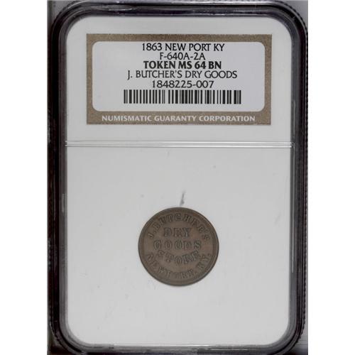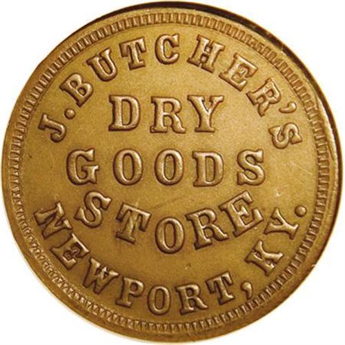 <B>1863 J. Butcher's Dry Goods, Fuld-KY-640A-2a, R.6, Newport, KY, MS64 Brown NGC.</B></I> Scarce Kentucky Civil War token with chocolate surfaces and traces of original mint luster. Current catalog value in MS60 is $270.