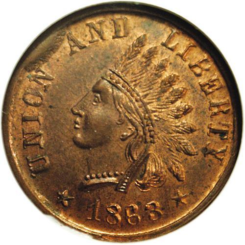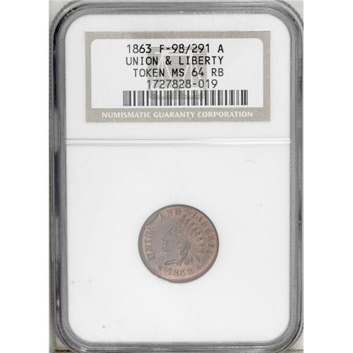 <B>1863 Union and Liberty, Fuld-98/291A, R.5, MS64 Red and Brown NGC.</B></I> Plenty of original luster remains on the surfaces of the token. There is a small rim cud between the words UNION AND. Current catalog values may be misleading when the token's grade approaches MS64 or better.<BR><I>From The Troy Wiseman Collection.</B></I>