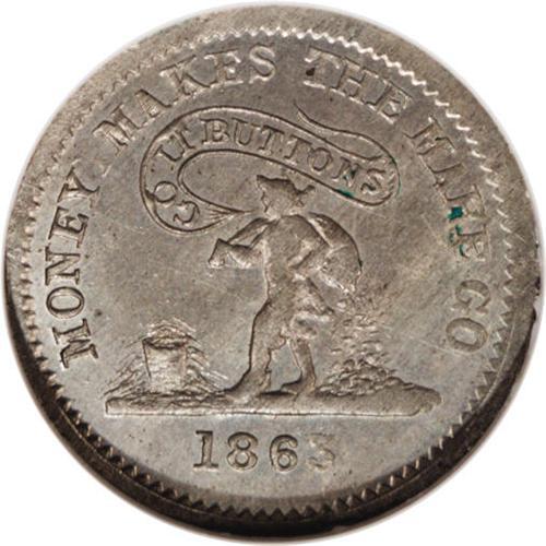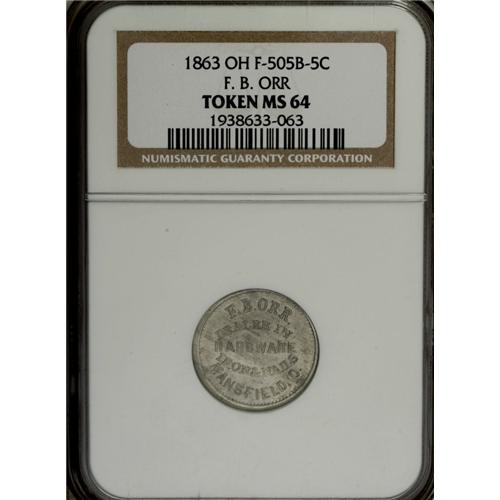 <B>1863 F.B. Orr Hardware, Mansfield, OH, Fuld-OH-505B-5c, R.8, MS64 NGC.</B></I> White metal. Another example from Orr, just as scarce as the previous lot. Listed in Fuld with the die pair of 505B and 1243 (MONEY MAKES THE MARE GO) and valued at $125 in MS60.<BR><BR><b>Shipping:</b> Coin/Currency (<a target="_blank" href="http://www.heritageauctions.com/common/shipping.php">view shipping information</a>)