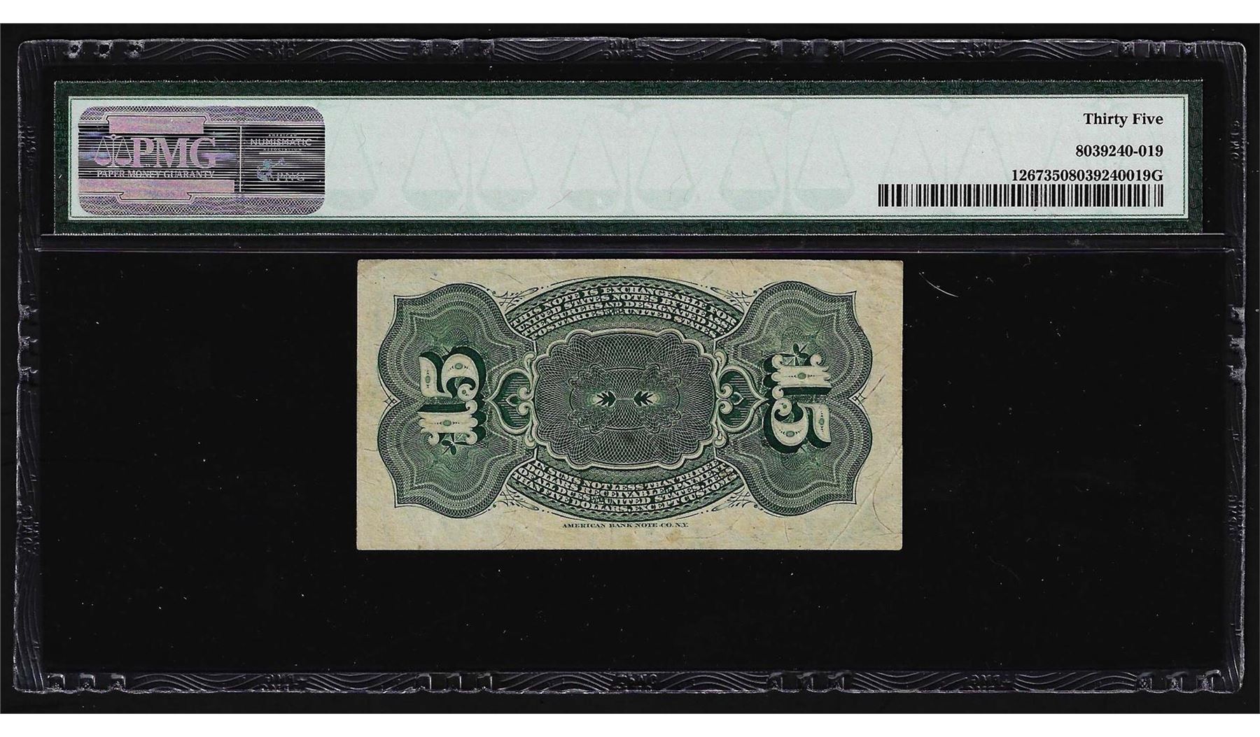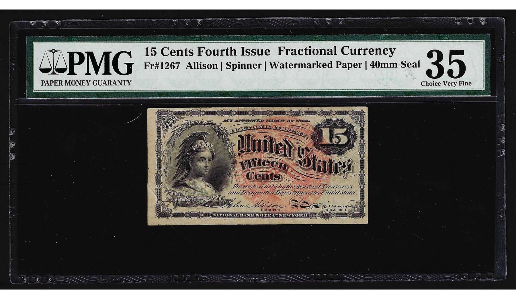 One 1863 Fifteen Cents Fourth Issue Fractional Currency Note PMG Choice Very Fine 35. PMG Certified.