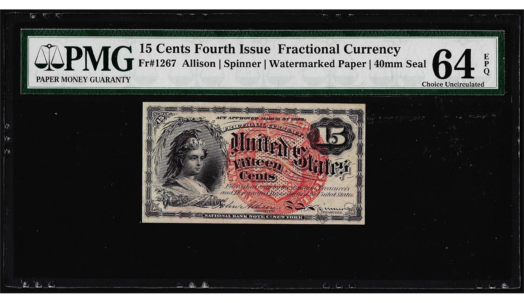 One 1863 Fifteen Cents Fourth Issue Fractional Note Fr.1267 PMG Uncirculated 64EPQ. PMG Certified.