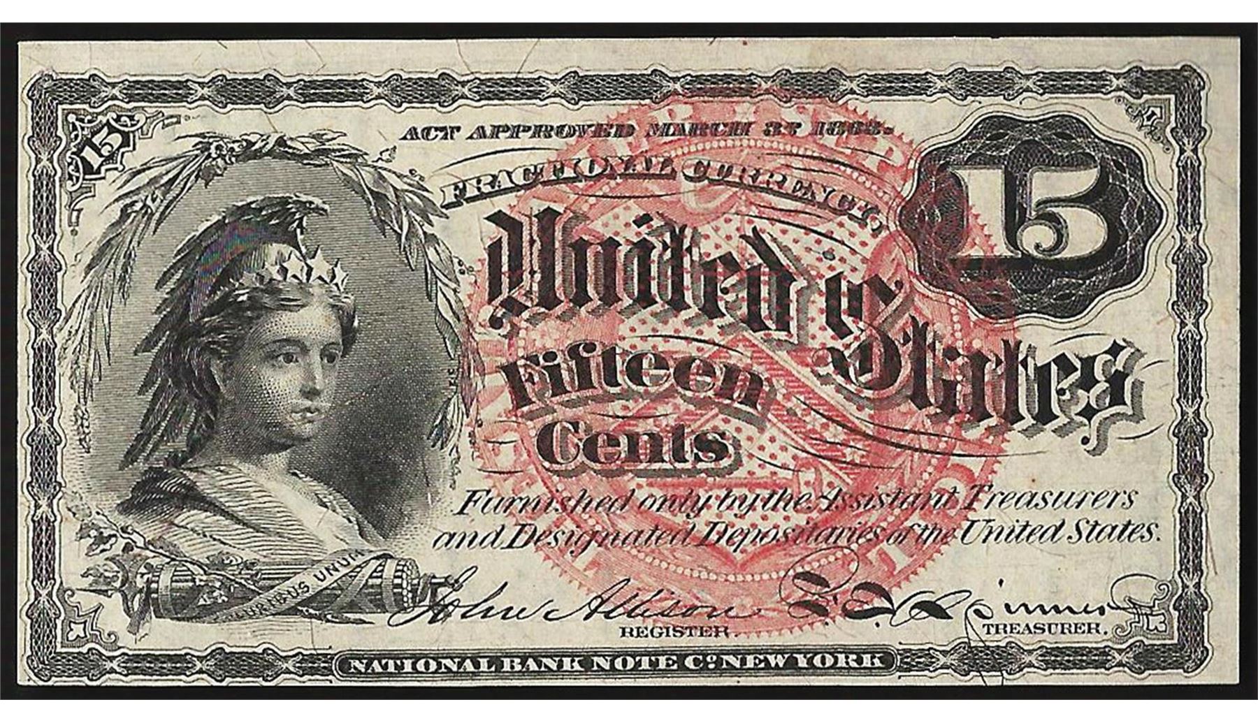One 1863 Fifteen Cents Fourth Issue Fractional Note.