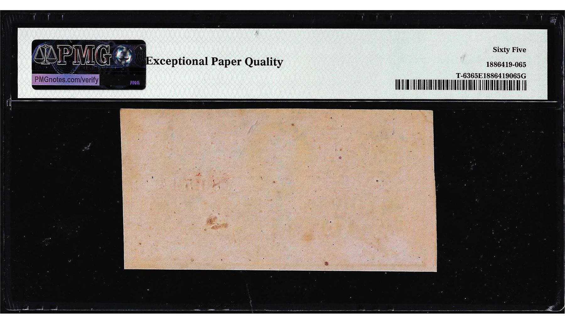 One 1863 Fifty Cents Confederate States of America Note T-63 PMG Gem Uncirculated 65EPQ. PMG Certified.