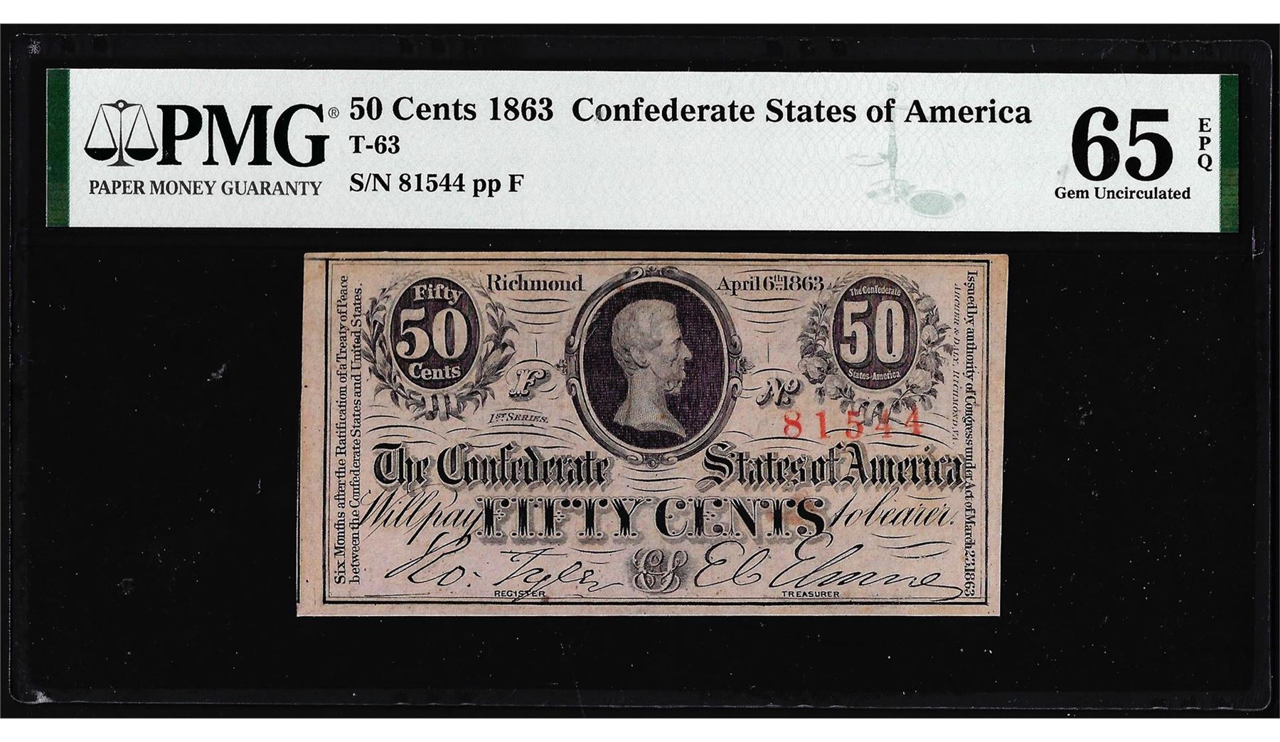 One 1863 Fifty Cents Confederate States of America Note T-63 PMG Gem Uncirculated 65EPQ. PMG Certified.