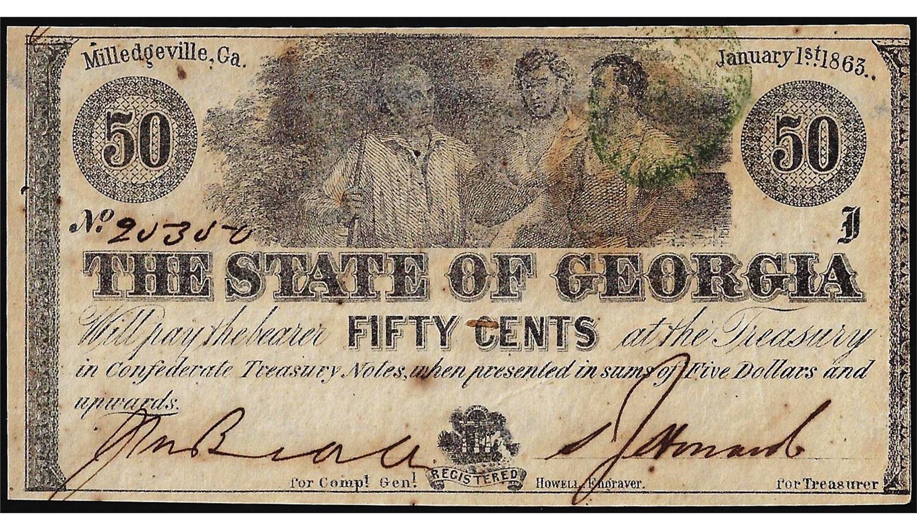 One 1863 Fifty Cents State of Georgia Milledgeville, GA Obsolete Note.
