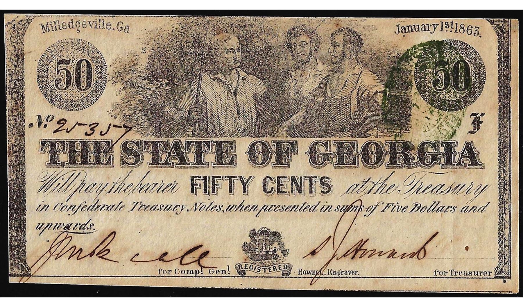 One 1863 Fifty Cents State of Georgia Milledgeville, GA Obsolete Note.
