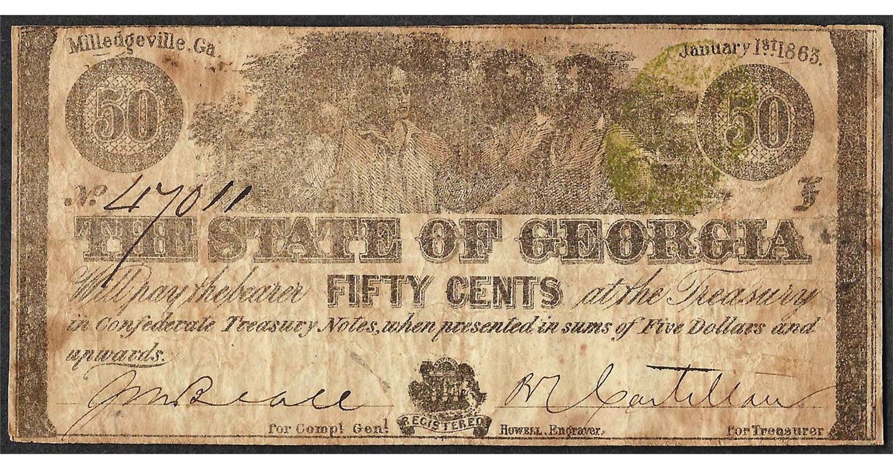 One 1863 Fifty Cents The State of Georgia Milledgeville Obsolete Note.