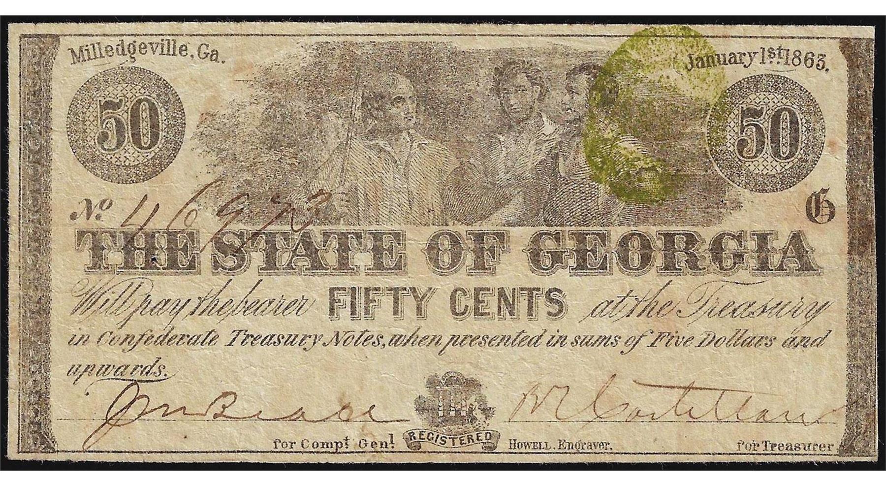 One 1863 Fifty Cents The State of Georgia Obsolete Bank Note.