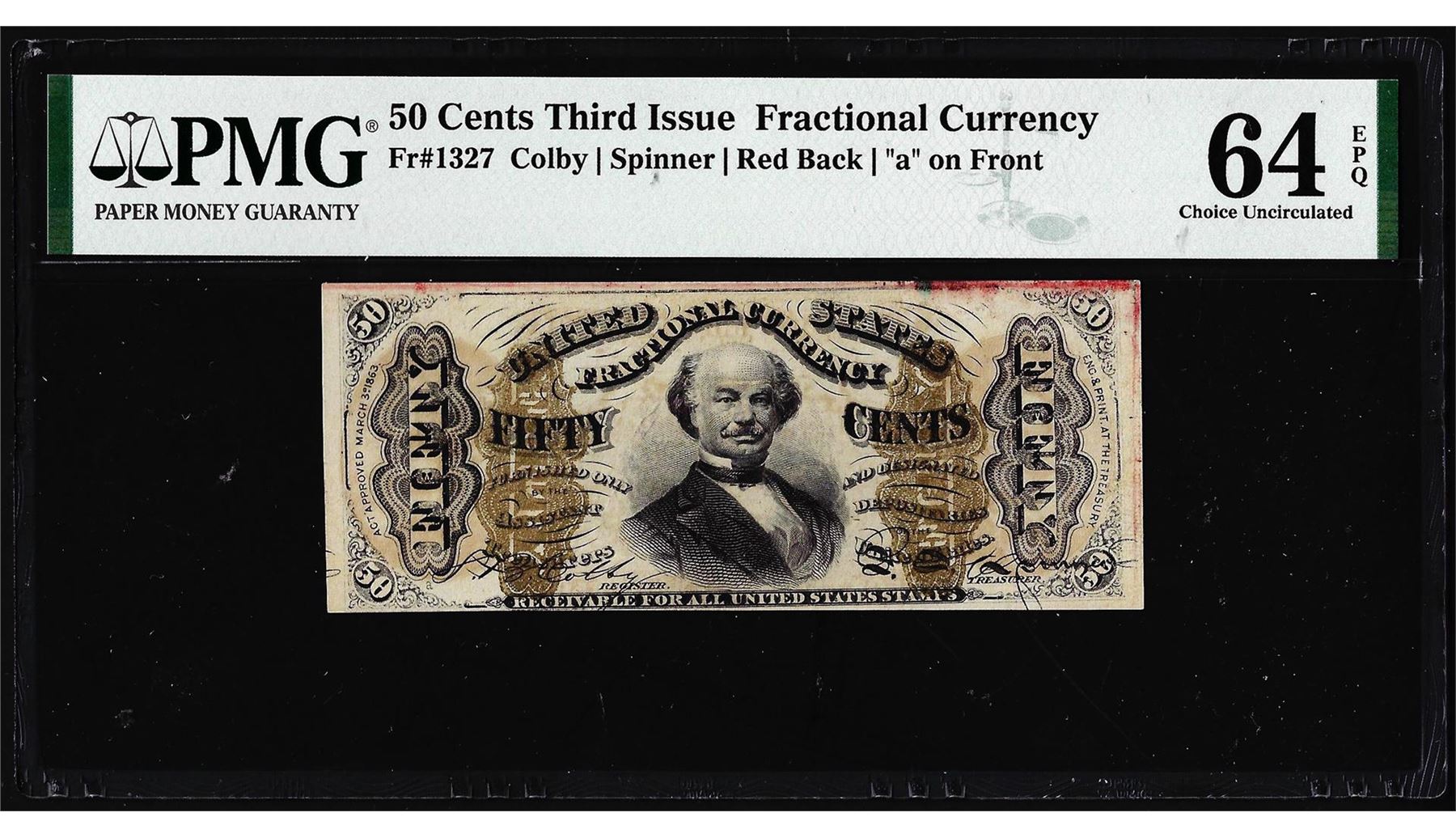 One 1863 Fifty Cents Third Issue Fractional Note Fr.1327 PMG Choice Uncirculated 64EPQ. PMG Certified.