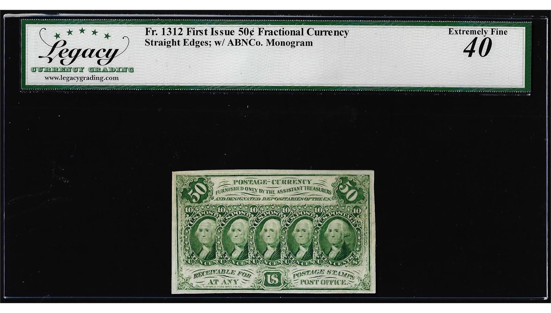 One 1863 First Issue 50 Cents Fractional Currency Note Fr.1312 Legacy Extremely Fine 40. Legacy Graded.