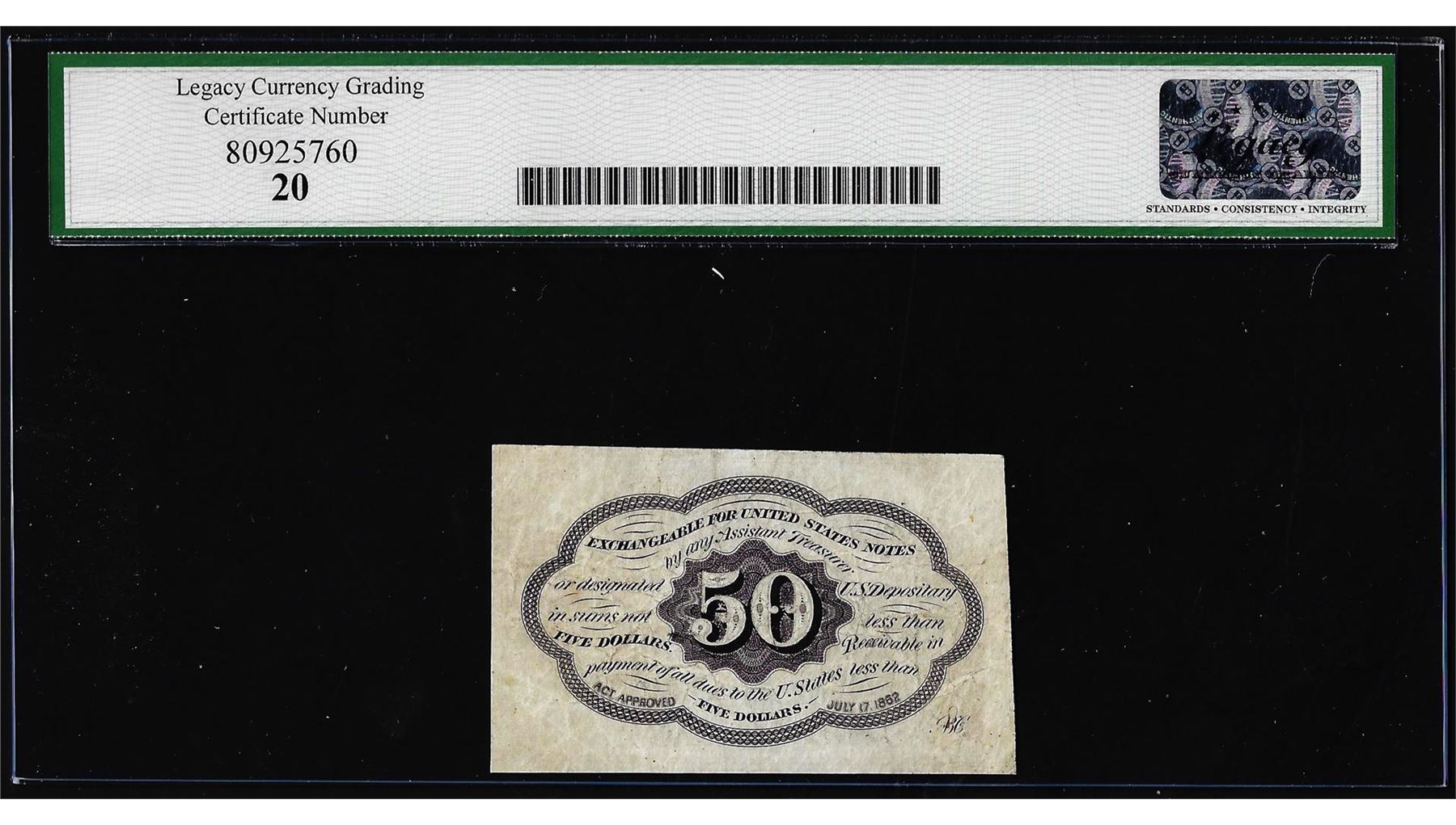 One 1863 First Issue Fifty Cents Fractional Currency Note Fr.1312 Legacy Very Fine 20. Legacy Graded.