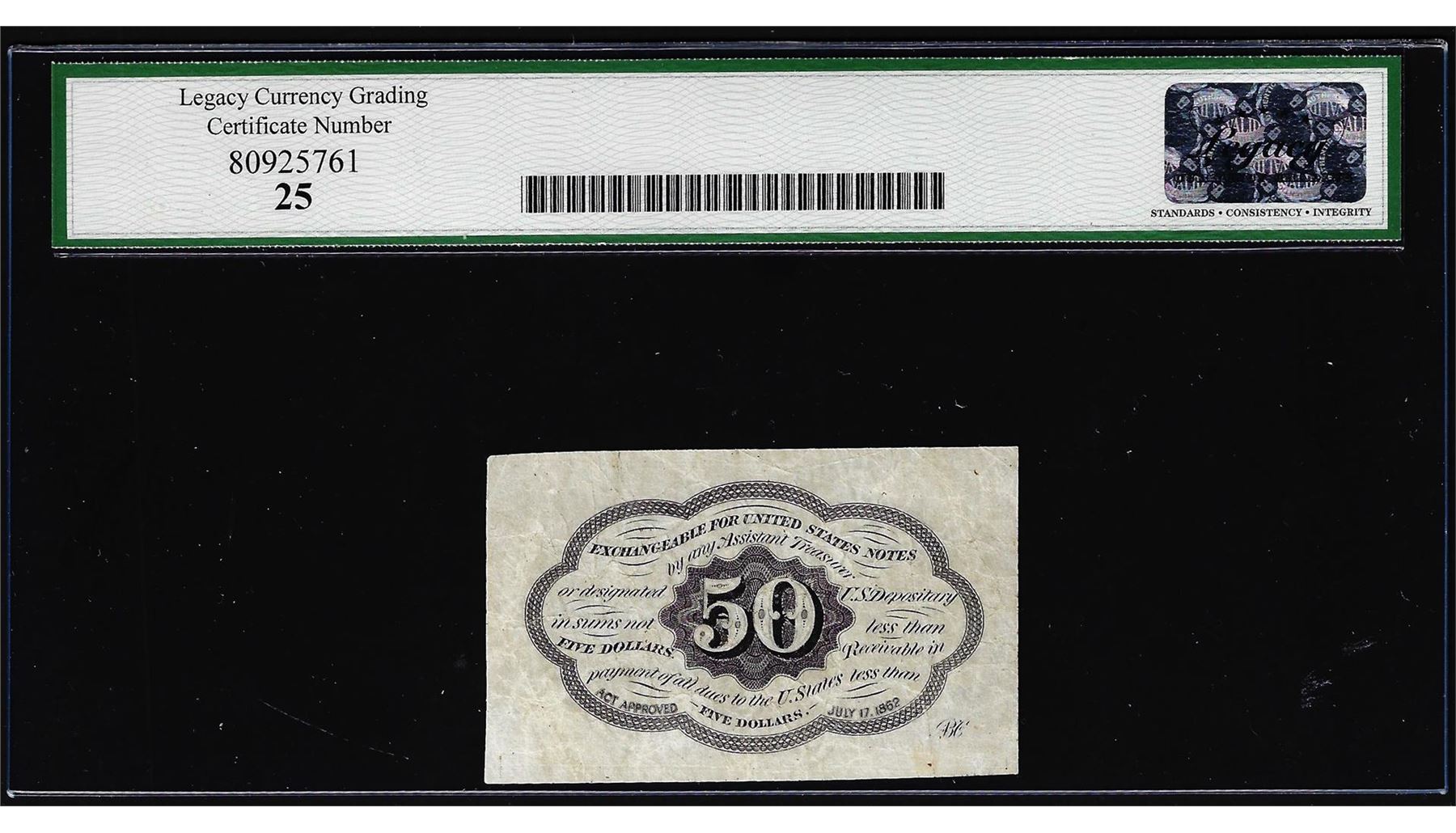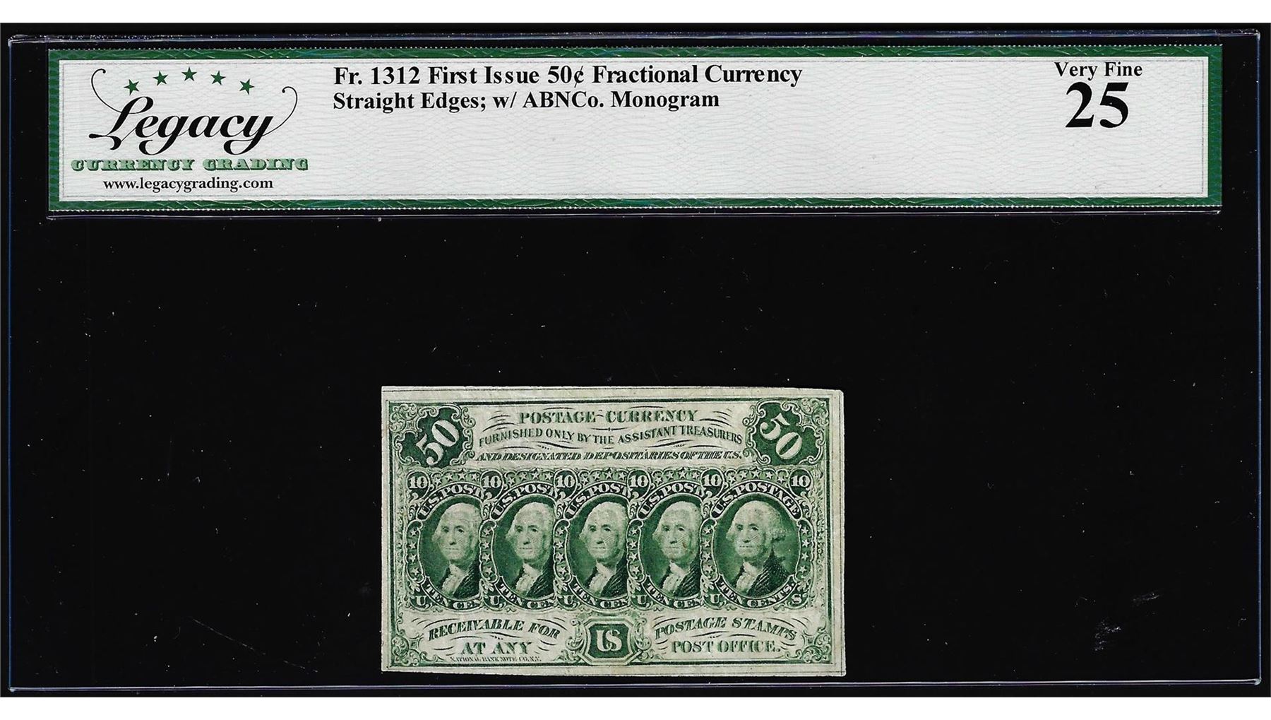 One 1863 First Issue Fifty Cents Fractional Currency Note Fr.1312 Legacy Very Fine 25. Legacy Graded.