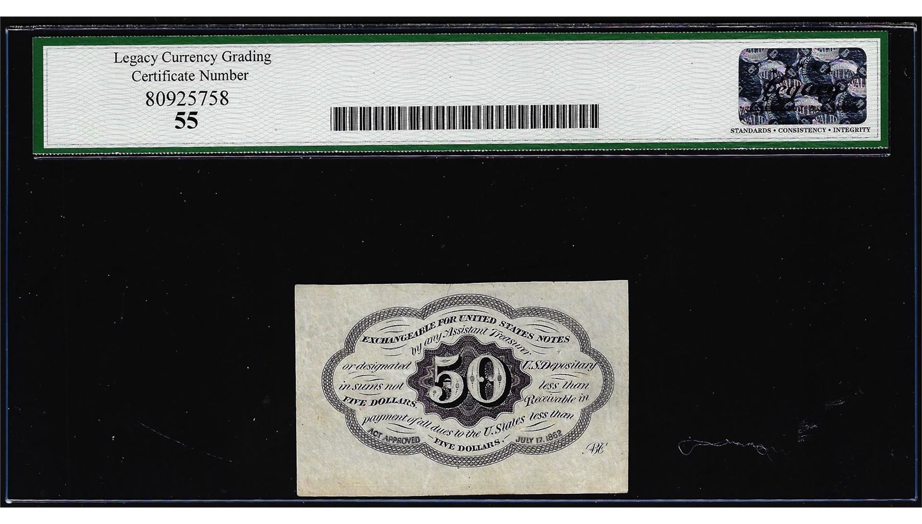 One 1863 First Issue Fifty Cents Fractional Note Fr.1312 Legacy Choice About New 55. Legacy Graded.