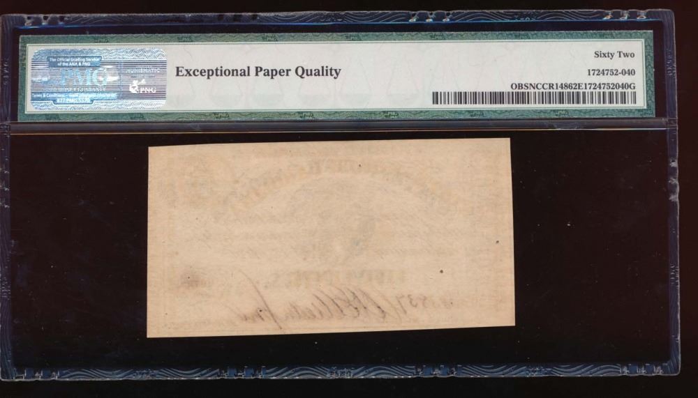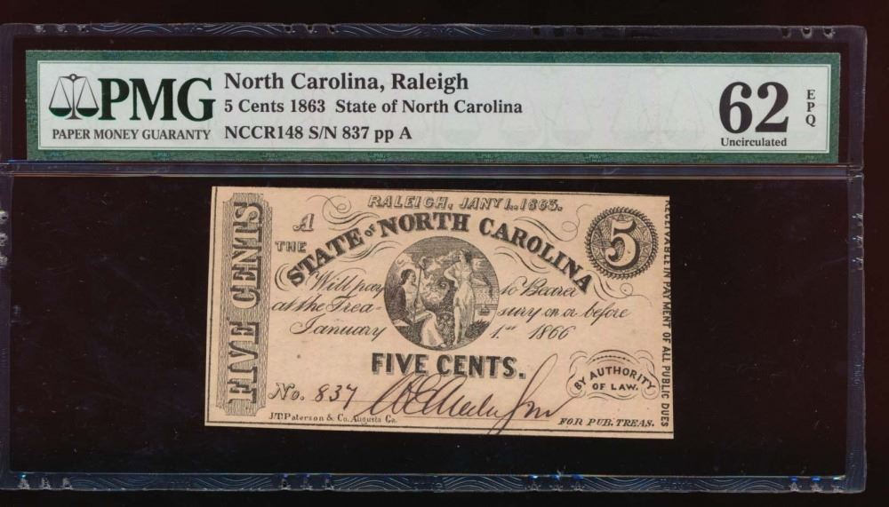 One 1863 Five Cent North Carolina Obsolete Note PMG 62EPQ.